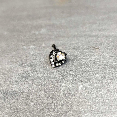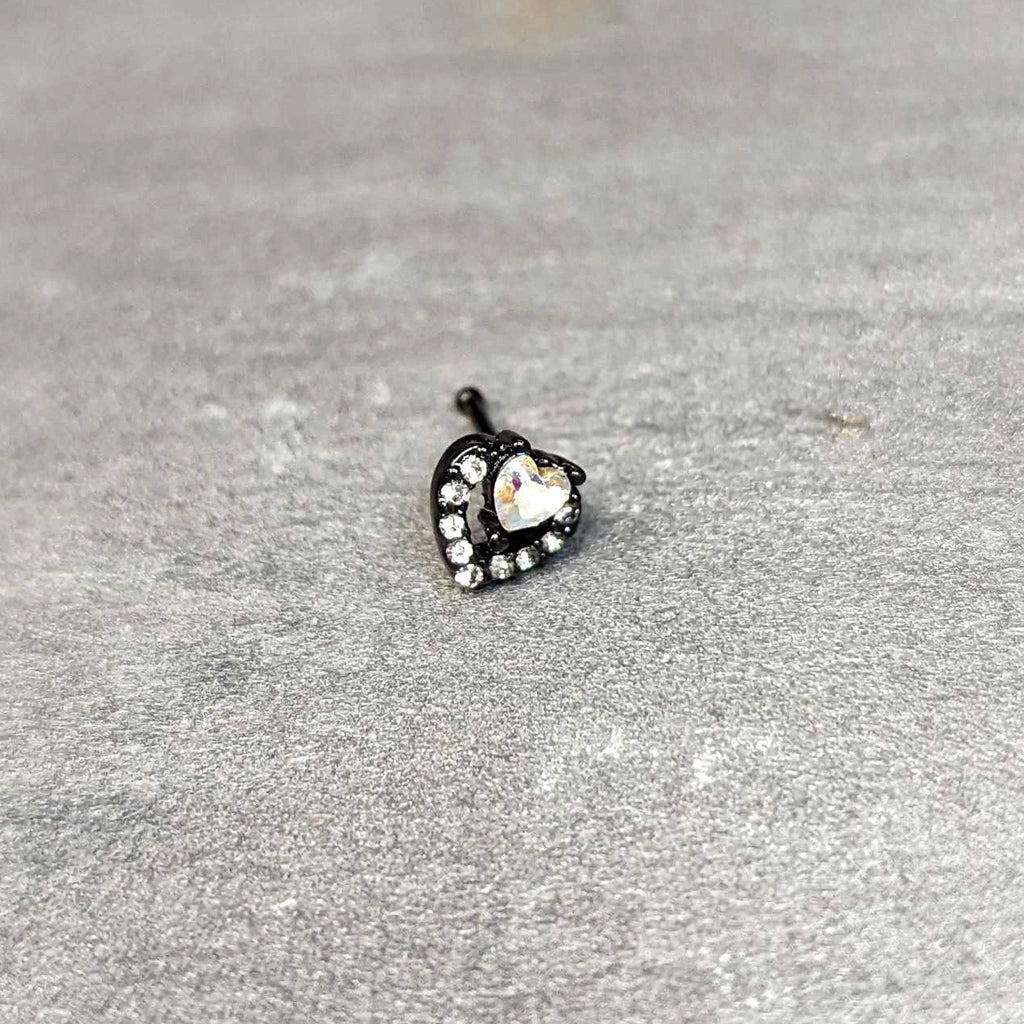 Look luxe and love it without breaking the bank with this 20 gauge nostril ring! It's made with an 8mm black PVD over 316L surgical grade stainless steel straight post. It features a heart charm, paved with clear gems and set with a heart-shaped aurora gem at the top. You're going to fall in love with the opulent look of this heart-themed nose piercing ring!Specifications
