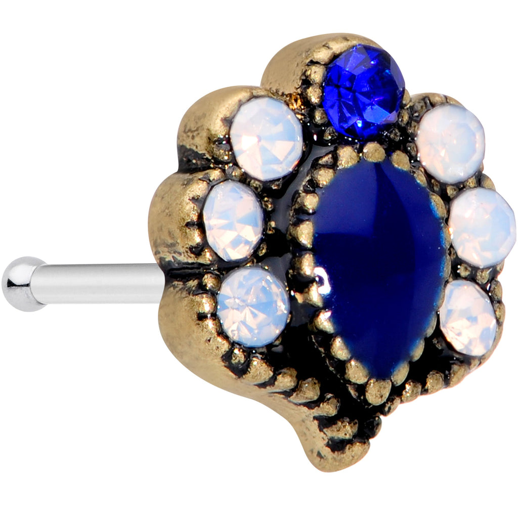 Get timeless style on very modern jewelry with this 20 gauge nostril ring! It's made with a 6mm durable 316L surgical grade stainless steel straight post. It features a blue gem charm with one gem shaped like a teardrop and the other round. The charm is embellished with clear gems along the side for a look that's opulent but not overwhelming. Take your nose piercing back in time with this gorgeous, antique-inspired nostril jewelry!Specifications