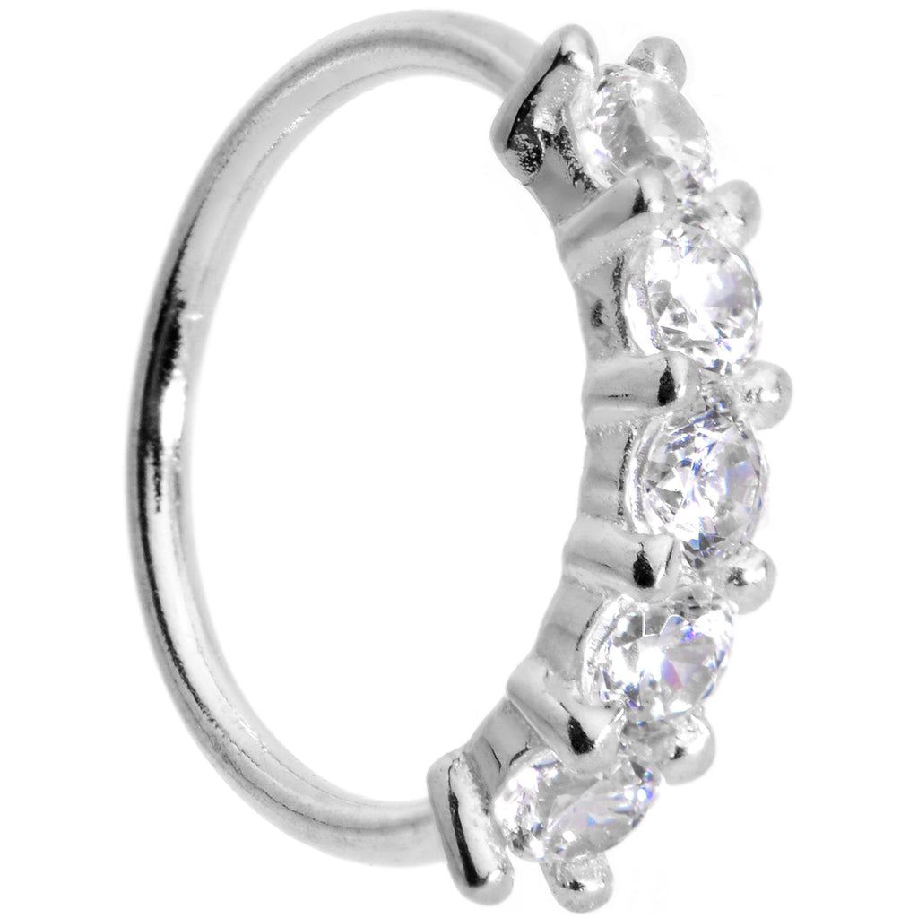 You'll feel like the belle of the ball while you're wearing this 20 gauge universal body jewelry encrusted with five clear cubic zirconia gems. The 1/4" circular ring is made with 14k white gold, and is bendable for ease of use. To insert ring simply twist then squeeze rounded ends together and you're ready to go. Can be worn in a variety of piercings including your cartilage, daith, tragus, lip, nose, and any other body piercing that is a perfect fit for you!
