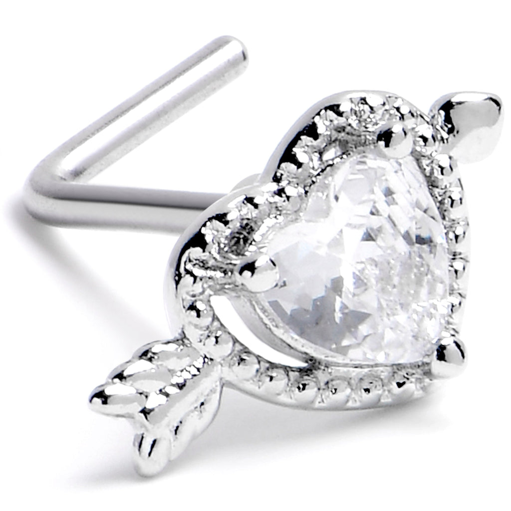 Let cupids arrow catch you with this 20 gauge nostril ring. It is made with a 6mm length at the bend 316L surgical grade stainless steel L-shaped post. It features a heart charm, composed of a clear cubic zirconia gem, surrounded by a second heart of textured detail and pierced by an arrow embellishment. You will totally fall in love with this nose piercing jewelry.Specifications