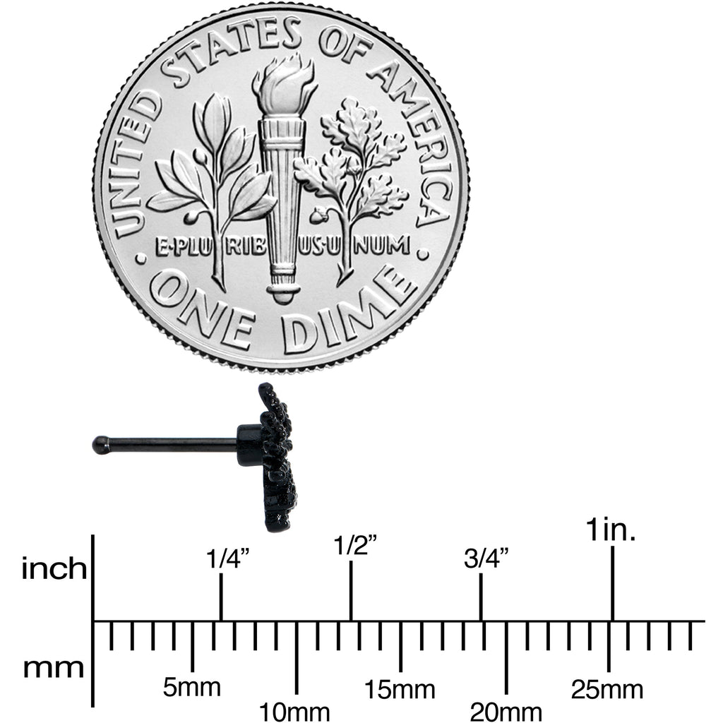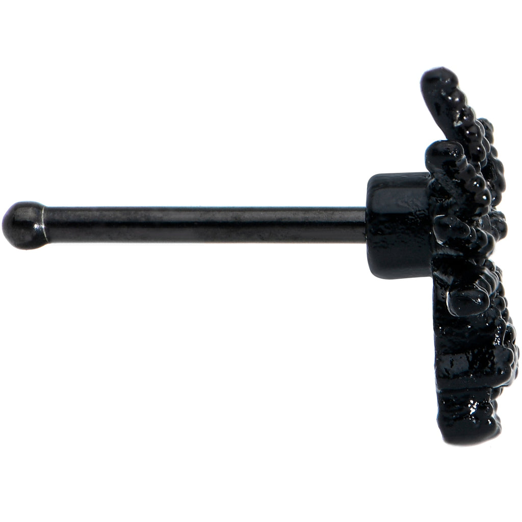This creepy crawly critter has found a new home on this 20 gauge nostril ring! It's made with a 6mm black PVD over 316L surgical grade stainless steel straight post and features a large black spider charm. The spider has a black textured detailing on its body and a clear gem at the center, to draw the eye in a way that's subtle but impossible to ignore. So don't ignore this creepy critter, let it crawl into your nose piercing and spin a web of beauty!Specifications