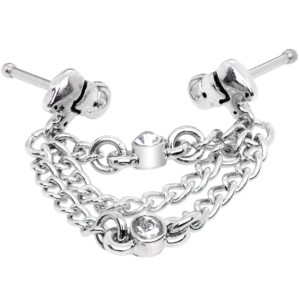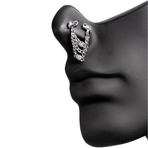 If you've got multiple nose piercings and are looking for brand new body jewelry then check out this 20 gauge double nose bone chain jewelry that you can wear in your multiple nostril piercings. Made with 6mm durable 316L surgical grade stainless steel posts, this double nose piercing jewelry features elephant ends and two nose bones connected by dangle chains with clear gems that can be worn in two piercings in one nostril or in high nostril piercings on either side of your nose.