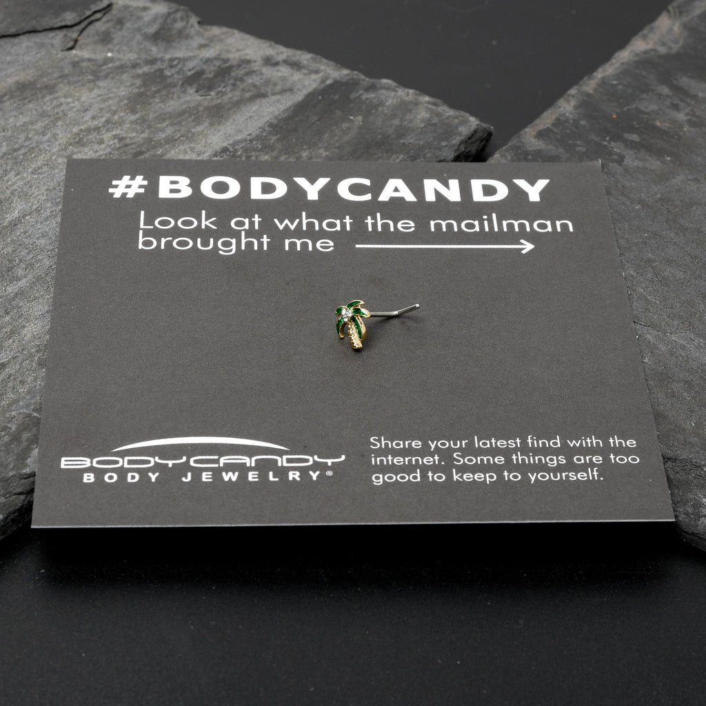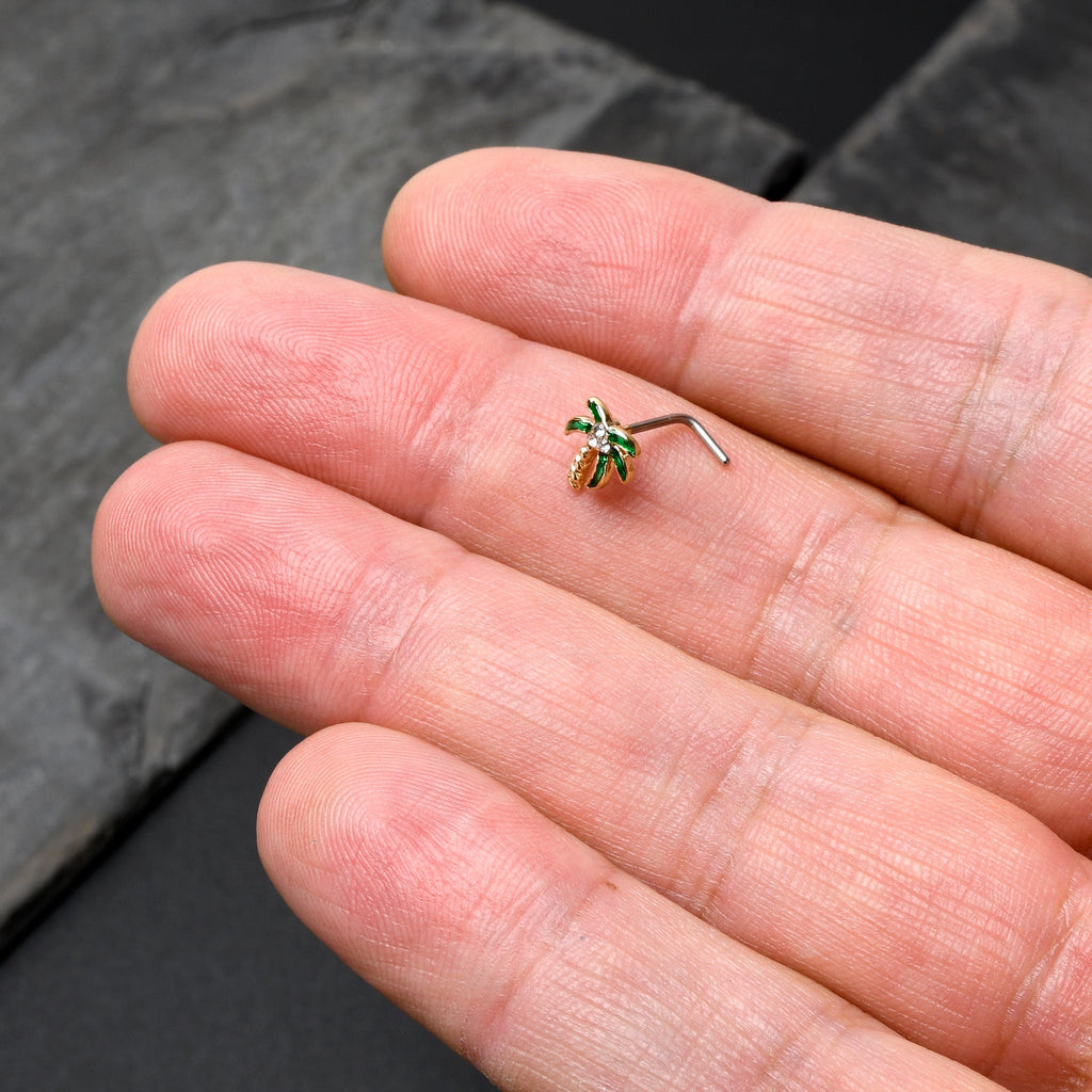 Take a trip to the tropics in total style like on this 20 gauge nostril ring. It is made with a 6mm length at the bend 316L surgical grade stainless steel L-shaped post. It features an elegant palm tree charm. The trunk features textured detailing while the top of the tree is set with clear gems. The leaves feature green inlay for elegant color contrast. Grab your beach towel and sunscreen, it is time to rock a tropical look with this perfect palm tree nose piercing jewelry.Specifications