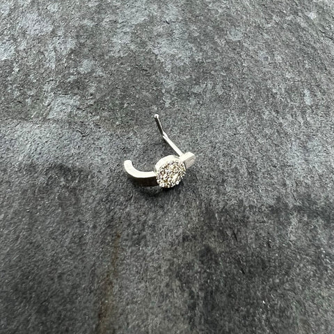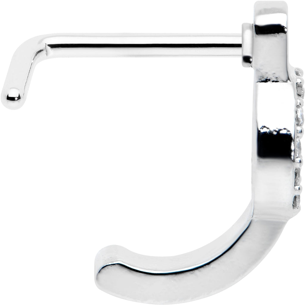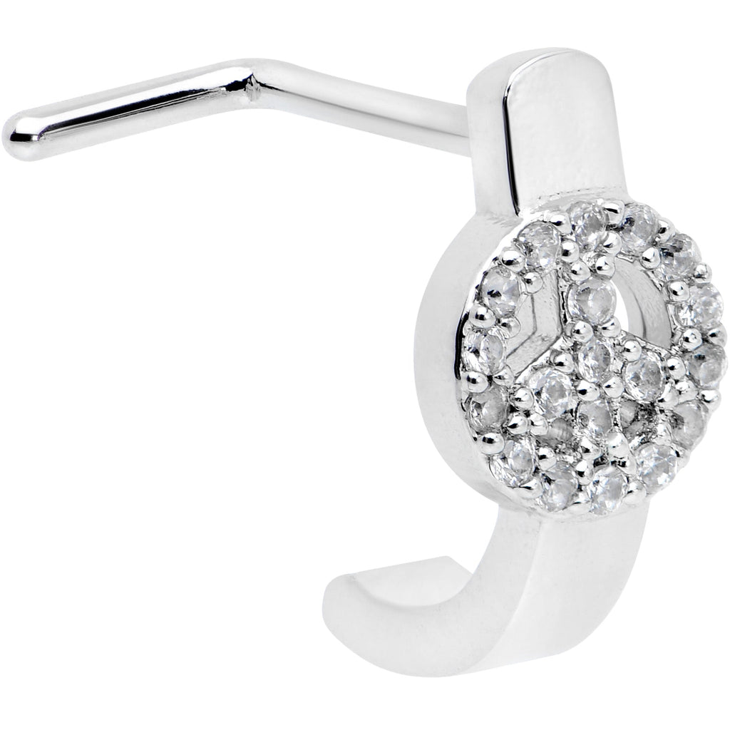 Why make war when peace looks this good? This nostril jewelry made with a 6mm length at the bend 316L surgical grade stainless steel L-shaped post and features a curving portion that emulates the look of a hoop while offering the fit of a nose bone. The top features a peace sign charm paved in clear gems for a look that mixes politics with panache while the hoop portion features a smooth finish that lets the peace sign take center stage. This nose piercing ring is sure to make you a happy hippie!Specifications