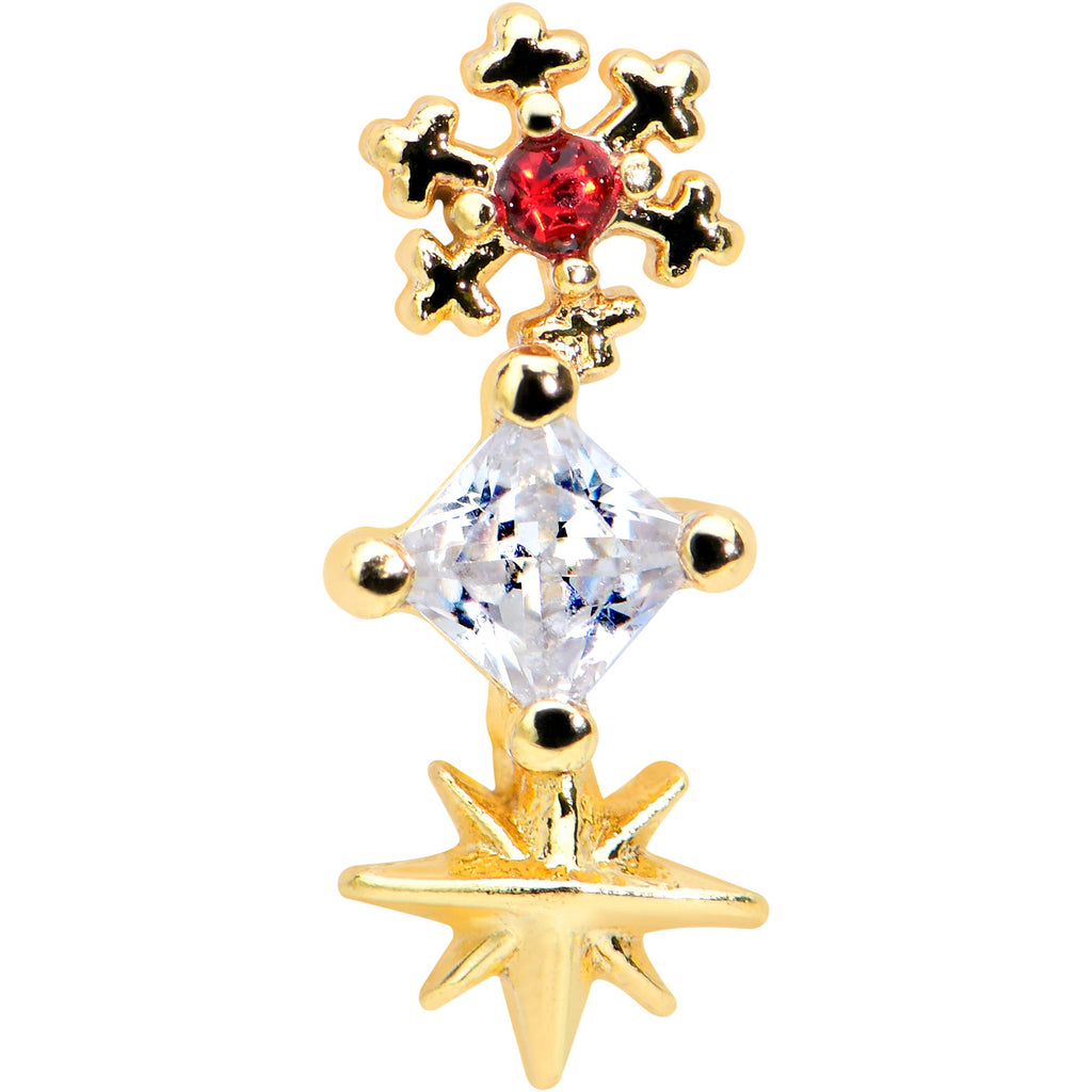 Add all the excitement and festivity of Christmas Eve to your look with this 20 gauge nostril ring! It's made with a 6mm gold tone PVD over 316L surgical grade stainless steel straight post. It features a snowflake charm, set with a red gem center. Beneath it is a clear gem, with a star at the bottom. Get ready to feel the holiday spirit with this elegant star and snowflake nose piercing jewelry.Specifications