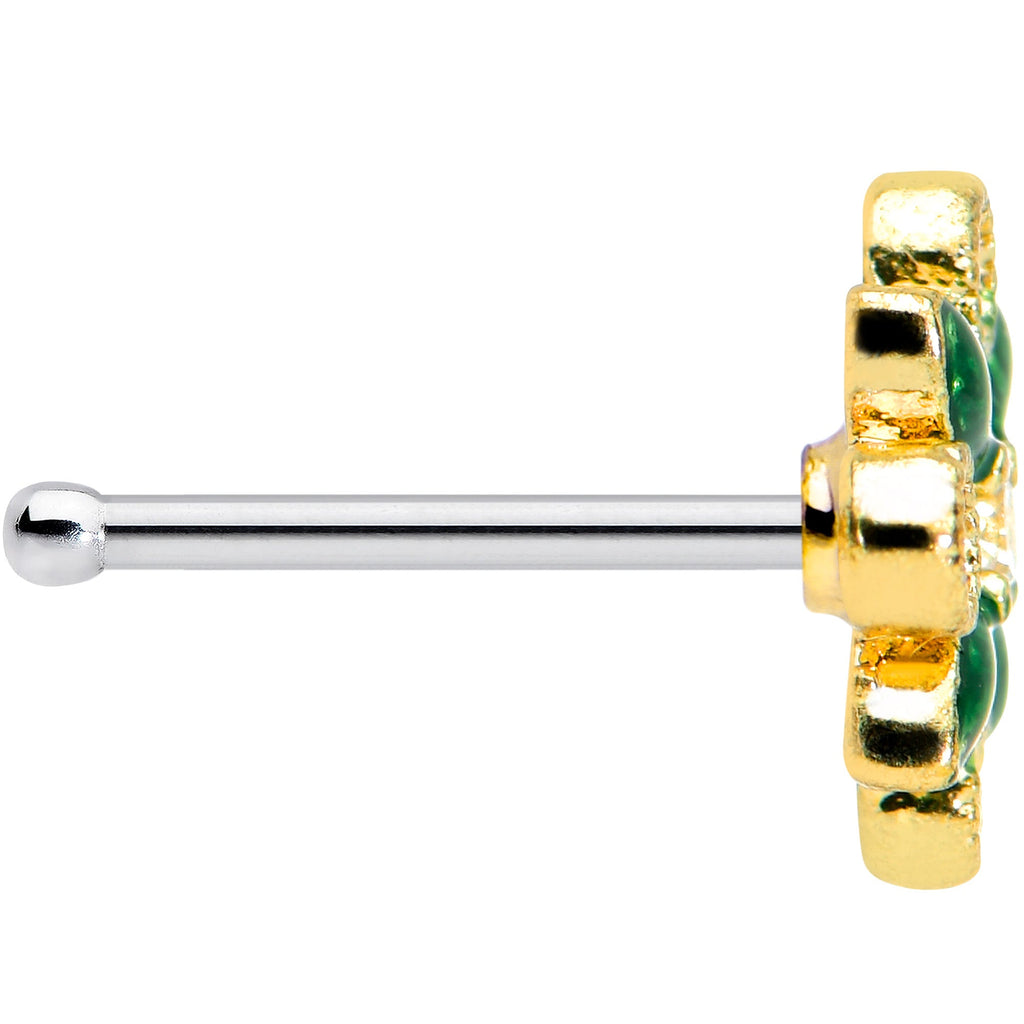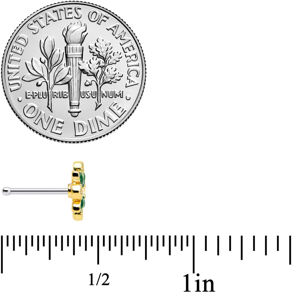 Decorate your nose piercing for the holiday season with this 20 gauge nostril ring! It's made with a 6mm durable 316L surgical grade stainless steel straight post. It features a spray of holly charm with green inlaid leaves. The berries are red gems and it's set at the center with a clear gem for a cohesive appearance. Give your nostril piercing a festive feel with this holiday holly nose jewelry!Specifications