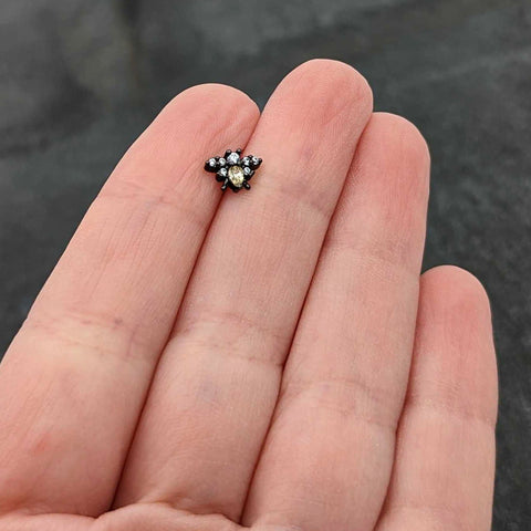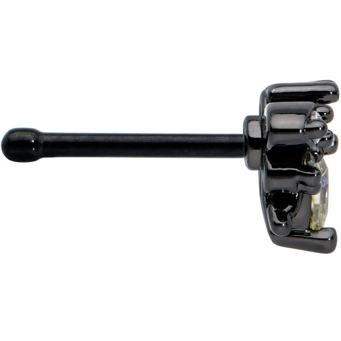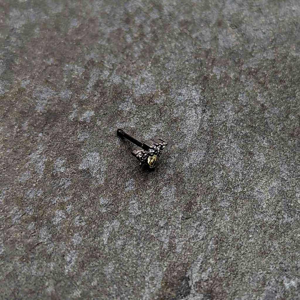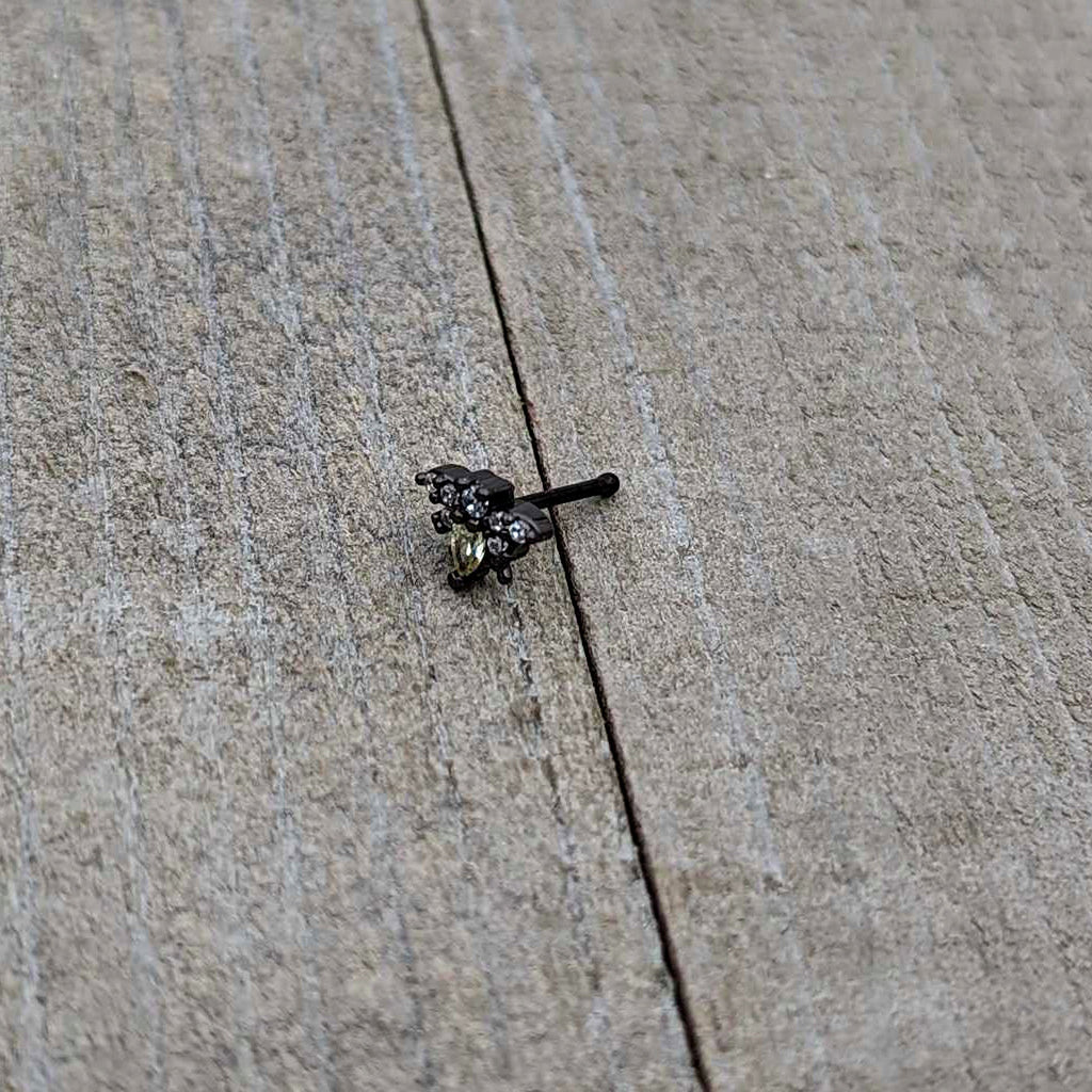 Give your heart a flutter with this 20 gauge butterfly nostril ring! It's made with a 6mm black PVD over 316L surgical grade stainless steel straight post. It features a butterfly charm. The butterfly has a yellow gem body and a clear gem head, while its wings are black and set with matching clear gems. You'll be ready to bloom with this beautiful butterfly nose piercing jewelry!