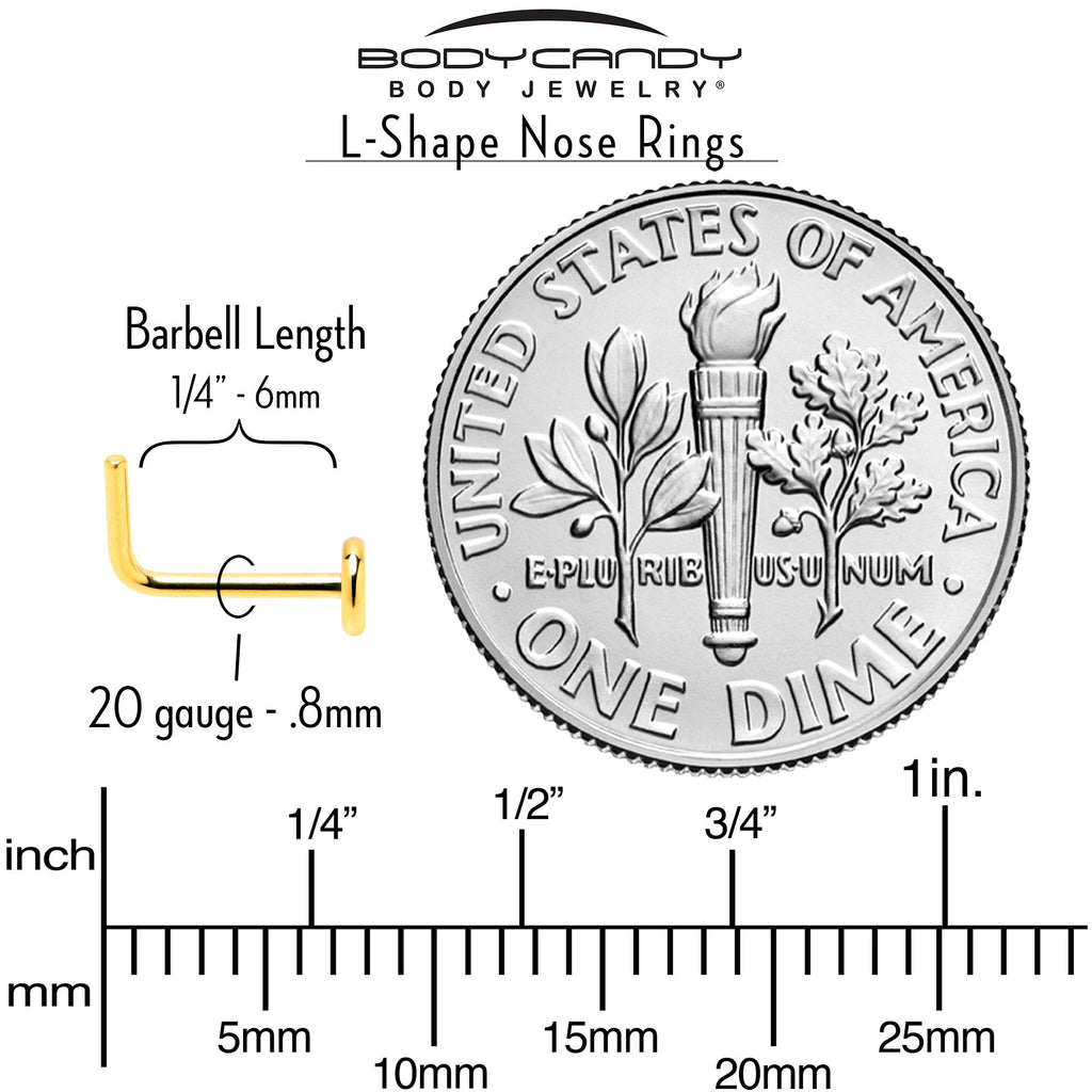 This 20 gauge nostril ring has everything you could possibly ask for. It's made with a 6mm length at the bend gold tone PVD over ASTM F-136 titanium (solid medical grade titanium) L-shaped post with a 3mm flat disc end. Your nostril piercing is covered with this simple and stylish nose jewelry.Specifications