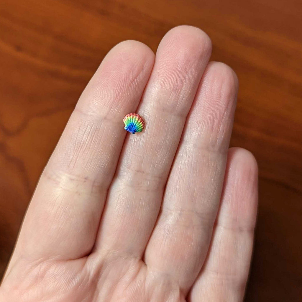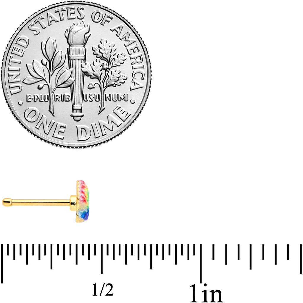 Show off your pride or nab a nautical look with this 20 gauge nostril ring. It's made with a 6mm gold tone PVD over 316L surgical grade stainless steel straight post. It features a scallop shell, embellished with a rainbow of colors all the way across. Whether you're at the beach, the bar, or relaxing at home, this nautical nose piercing jewelry will fill your look with rainbows!Specifications