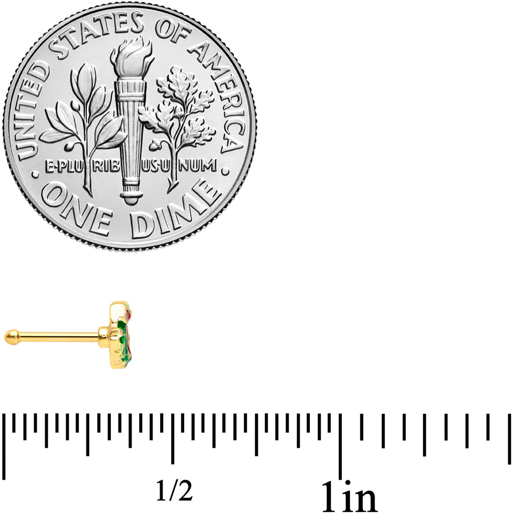 Give your look some Christmas cheer with this set of 20 gauge nostril jewelry! It's made with 6mm gold tone PVD over 316L surgical grade straight posts. The first features a green wreath charm embellished with a red and green bow. The second one features a red and white Santa Claus charm. The third one features a green Christmas tree with white and red ornaments. Give your nose piercings some classic cheer for the holidays with this colorful set of nostril piercing jewelry! Sold as a set of three.