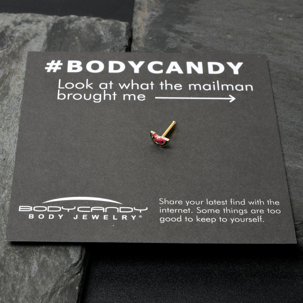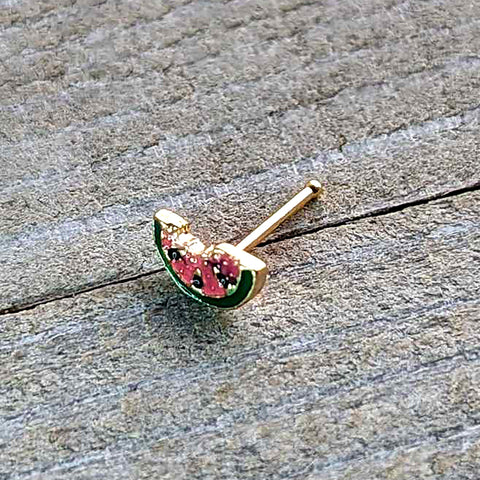 Take a bite of style with this tasty 20 gauge nostril ring. It is made with a 6mm gold tone PVD over 316L surgical grade stainless steel straight post. It features a watermelon slice charm, inlaid in red and green with black seed embellishments. The tasty fruit even has a bite already taken out. You too will find this yummy melon nose piercing ring irresistible.Specifications