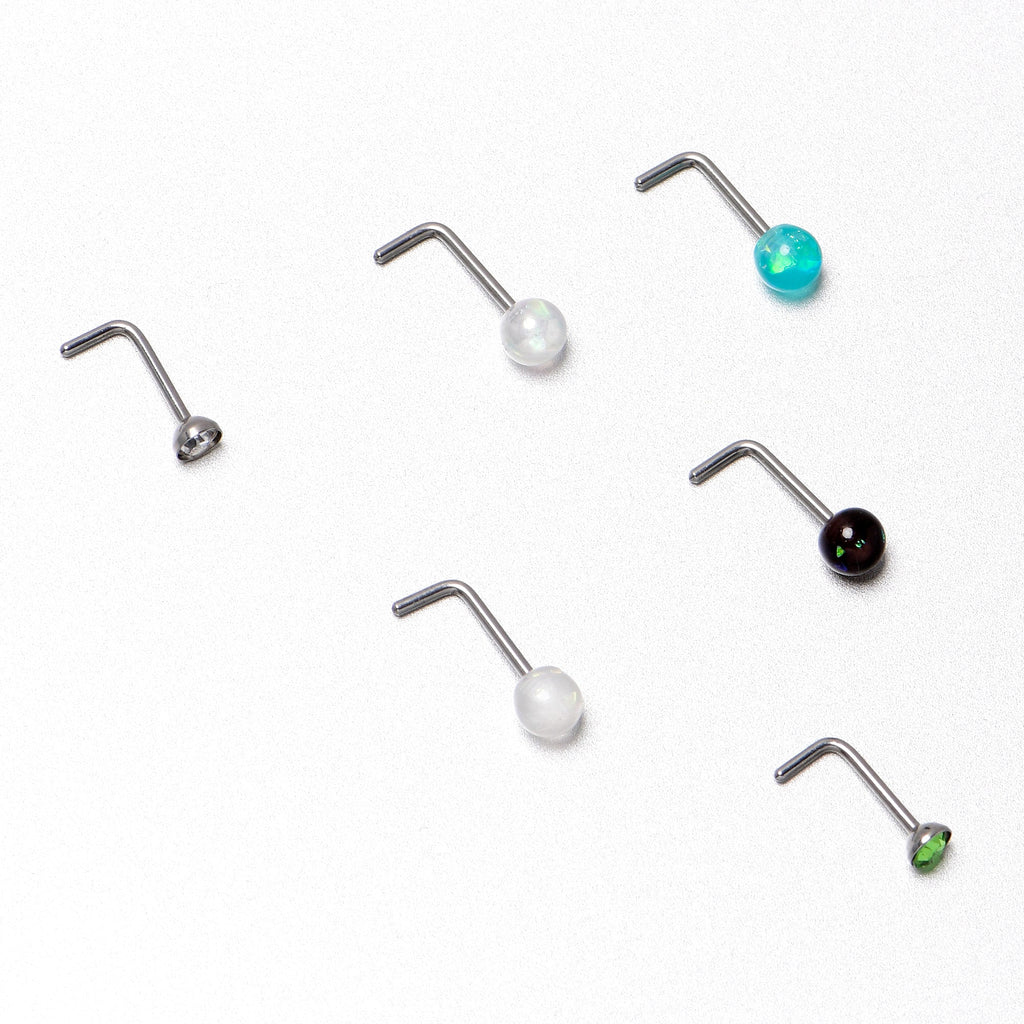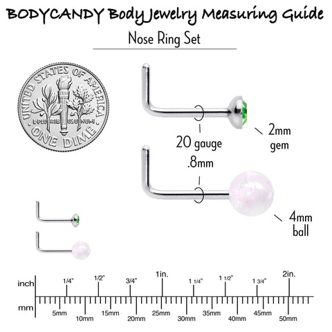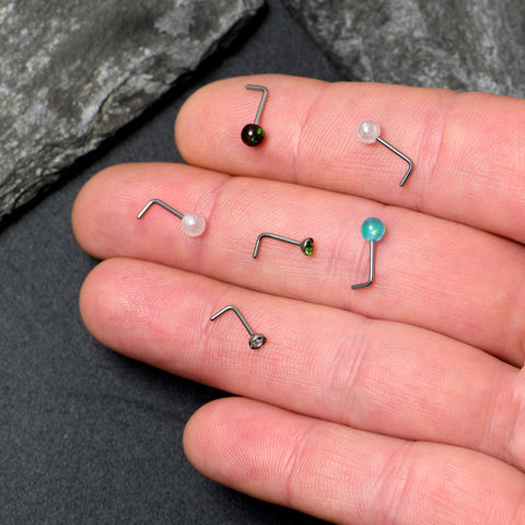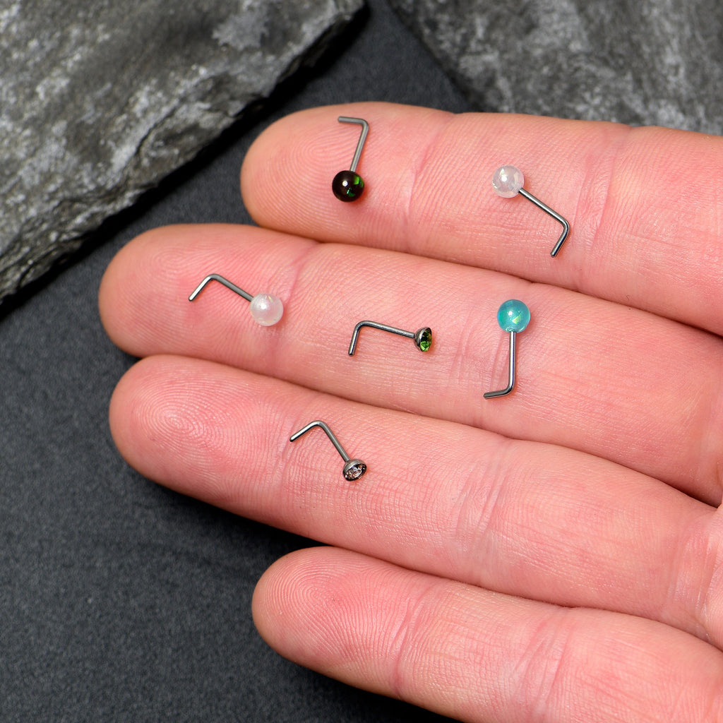 Simple colors can be simply stunning with these 20 gauge nostril rings. They are made with 6mm length at the bend 316L surgical grade stainless steel L-shaped posts. Each one features a different embellishment. One has a green gem end while another features a clear gem end. You also get one with a white faux opal, one with an aurora faux opal, one with a green faux opal, and one with a black faux opal. Keep it basic but beautiful with this charming nose piercing jewelry. Sold as a set of six.Specifications