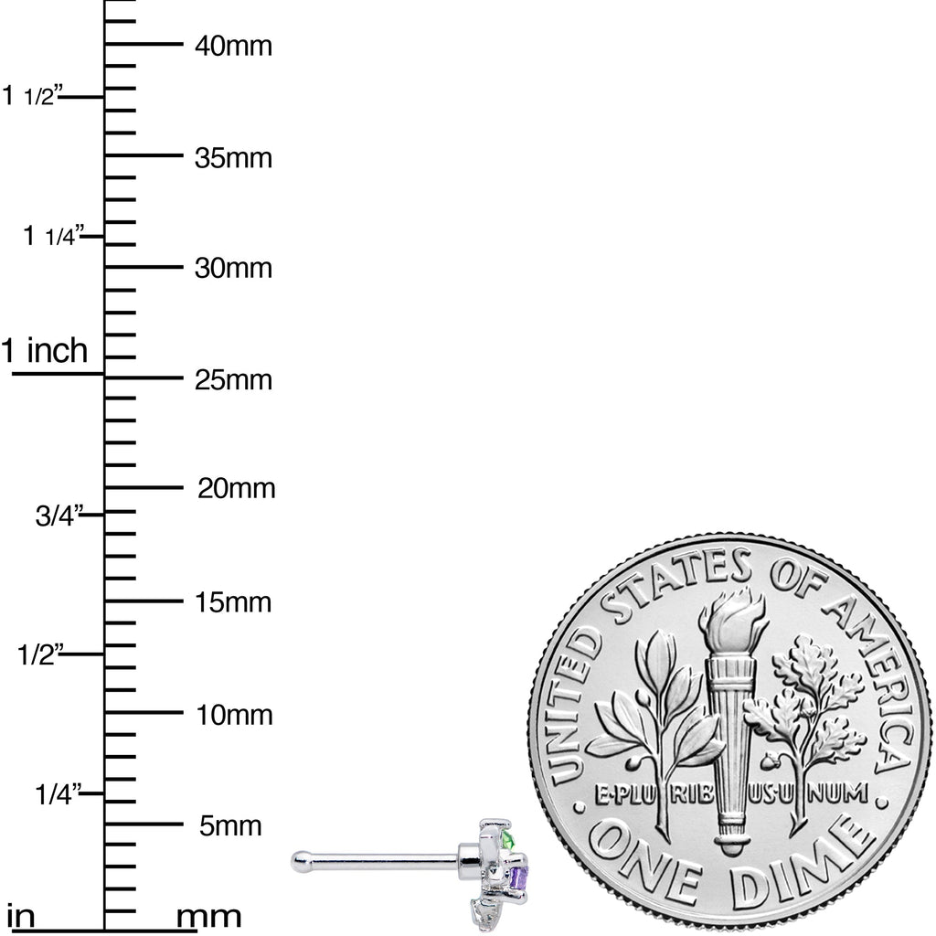 The delightful dragonfly on this 20 gauge nostril ring is so lovely it's almost magical! It's made with a 6mm durable 316L surgical grade stainless steel straight post. It features a dragonfly charm, with openwork wings and cohesive detailing that won't overwhelm. It also features a purple gem body and green gem head for a striking touch of color that'll cast a spell on you! Give your nose piercing a touch of nature with this delicious dragonfly nose ring.Specifications