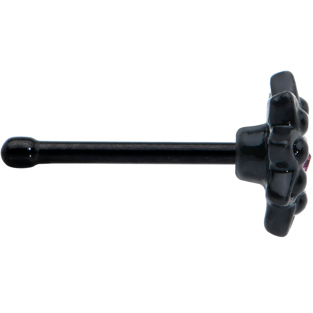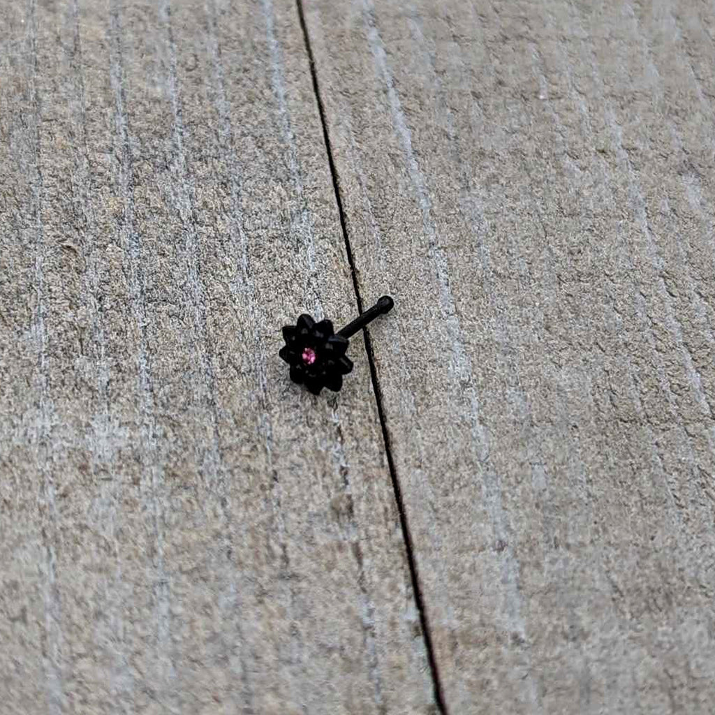 Go dark for Halloween, like this 20 gauge nostril ring! It's made with a 6mm black PVD over 316L surgical grade stainless steel straight post. It features a detailed flower, with petals in the deepest black. It's set at the center with a pink gem for stunning color contrast. Let your piercings bloom at night when you're rocking this striking starry flower nose piercing jewelry.Specifications