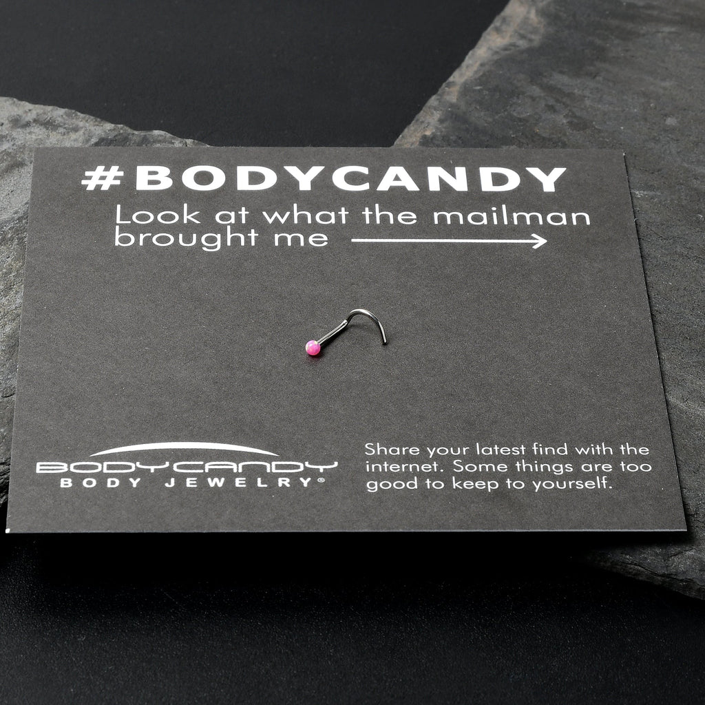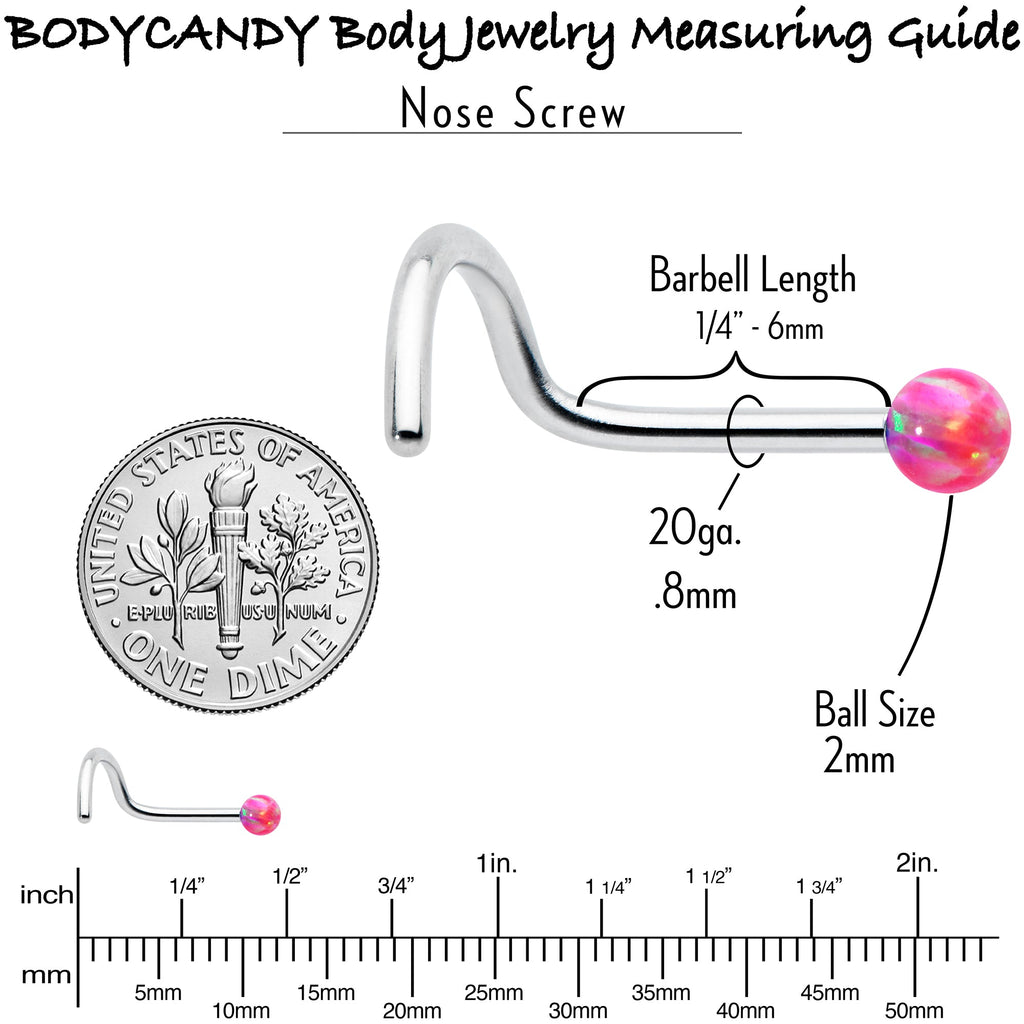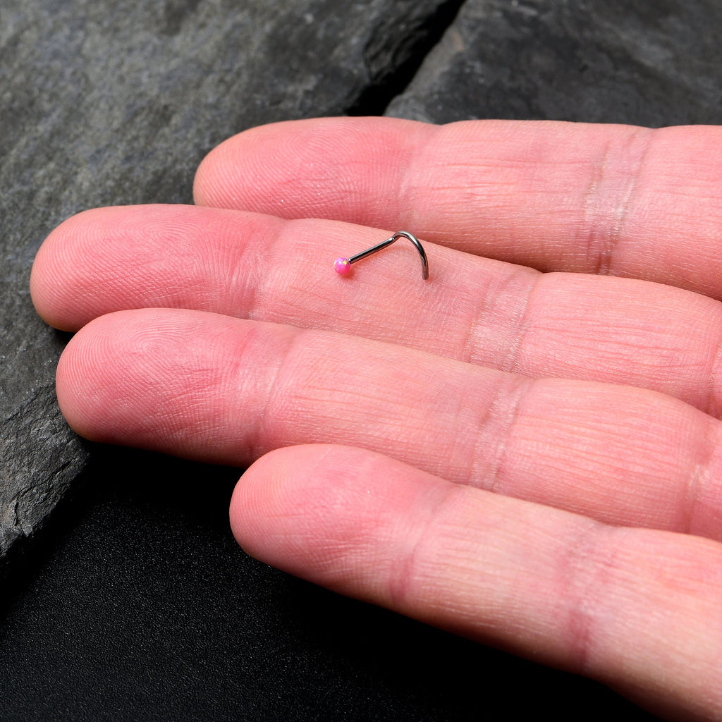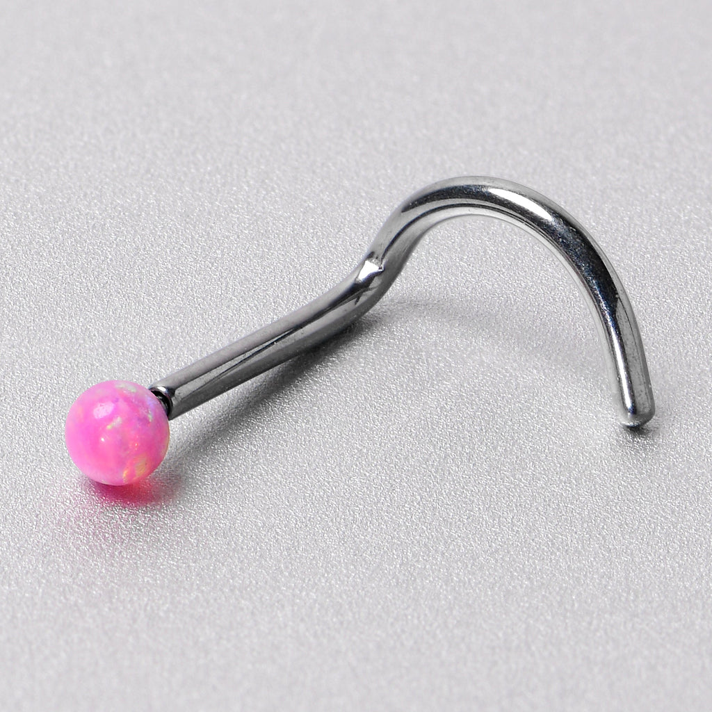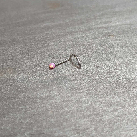 This 20 gauge nostril ring has all the details covered! It's made with a 6mm solid grade 23 implant grade titanium post. It features a pink synthetic opal ball end, with a threadless design to make insertion and removal an absolute breeze. It is designed for a left side nostril piercing and also has a curving design that makes for comfortable wear. This nose piercing jewelry has such a thoughtful design, you are sure to fall in love with it!Specifications