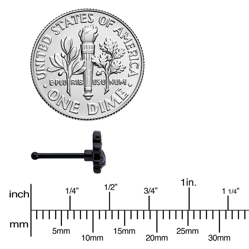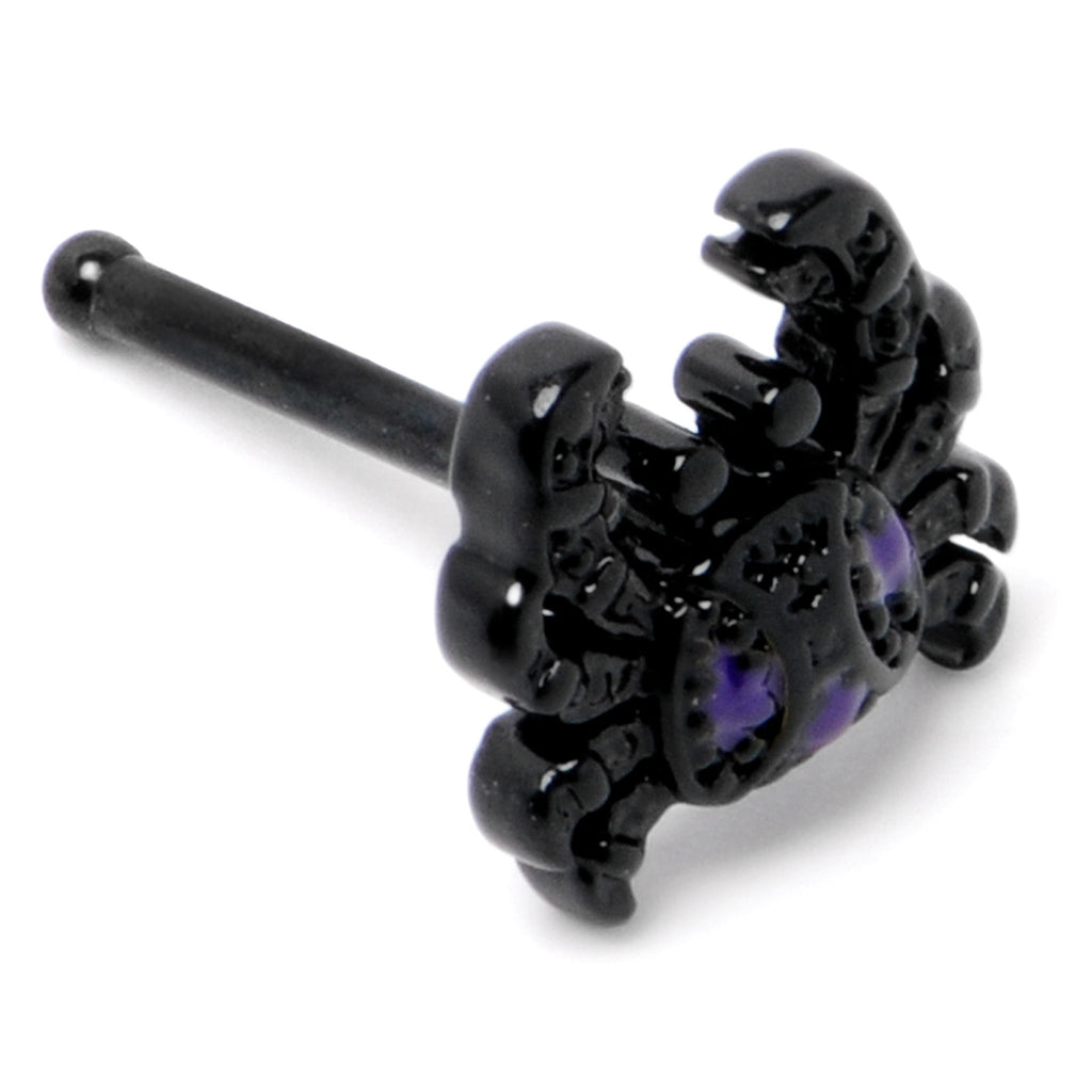 Catch a case of style when you are rocking this 20 gauge nostril ring. It is made with a 6mm black PVD over 316L surgical grade stainless steel straight post. It features a crab charm, black with purple gem embellishments. This chic crustacean is further embellished with textured detailing for a look that is sure to please. This colorful crabby charmer is a perfectly chic nose piercing ring.Specifications