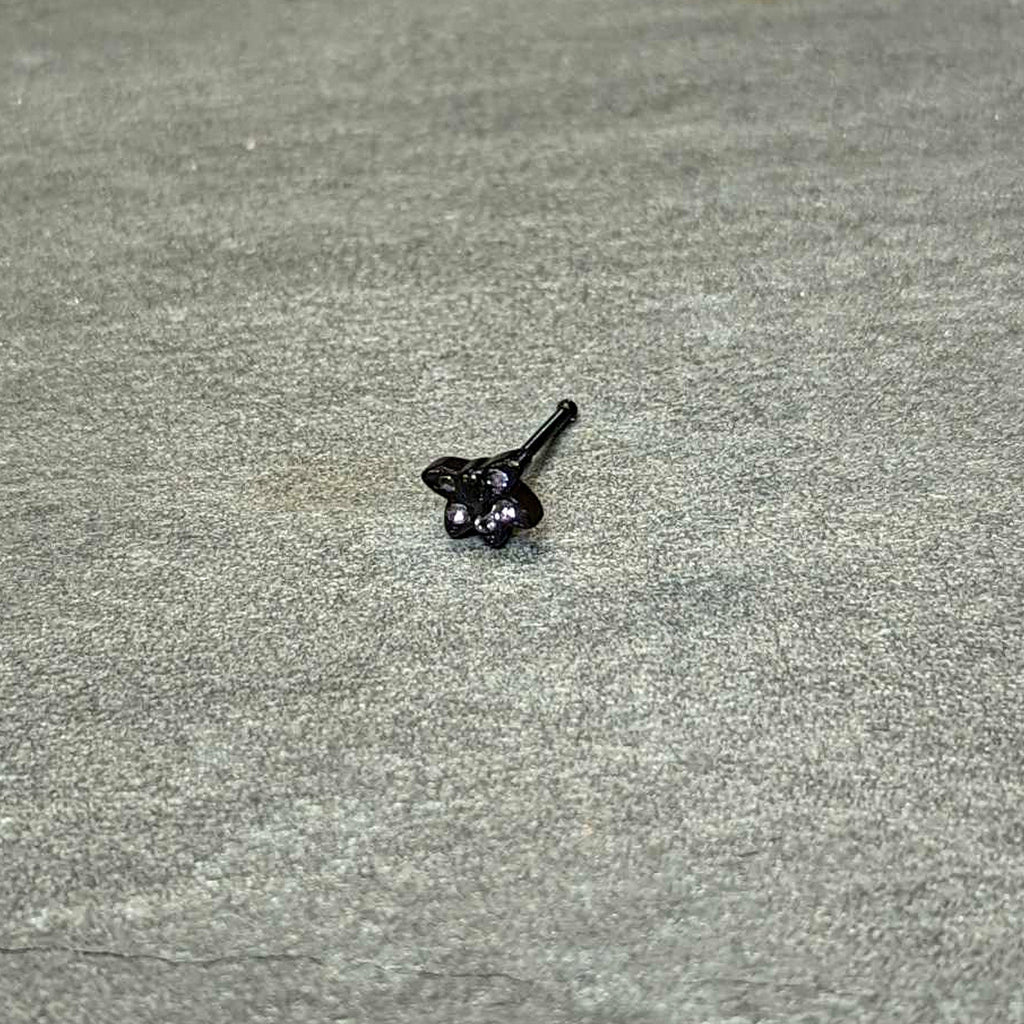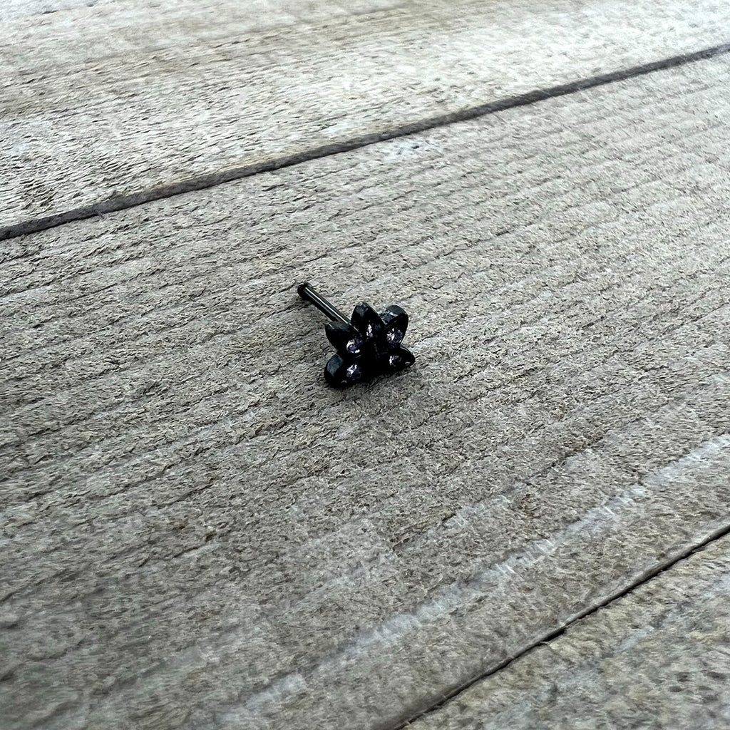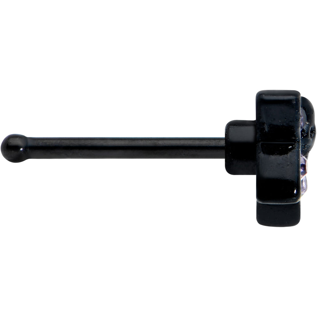 Fall in love with all things dark and creepy with this 20 gauge nostril ring! It's made with a 6mm black PVD over 316L surgical grade stainless steel straight post. It features a blooming floral charm. Each of the petals is set with a purple gem. At the center of the flower is a tiny skull, embellished with raised detailing. This is one nose piercing ring you'll love all the way down to the bone!Specifications