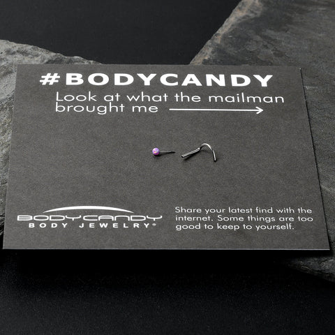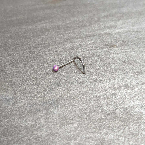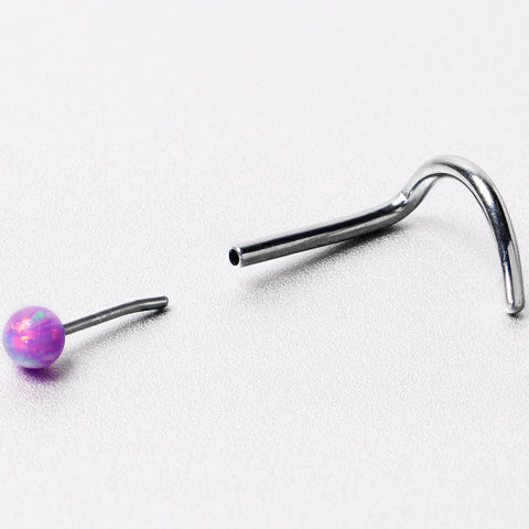 This 20 gauge nostril ring has all the details covered! It's made with a 6mm solid grade 23 implant grade titanium post. It features a purple synthetic opal ball end, with a threadless design to make insertion and removal an absolute breeze. It is designed for a left side nostril piercing and also has a curving design that makes for comfortable wear. This nose piercing jewelry has such a thoughtful design, you are sure to fall in love with it!Specifications