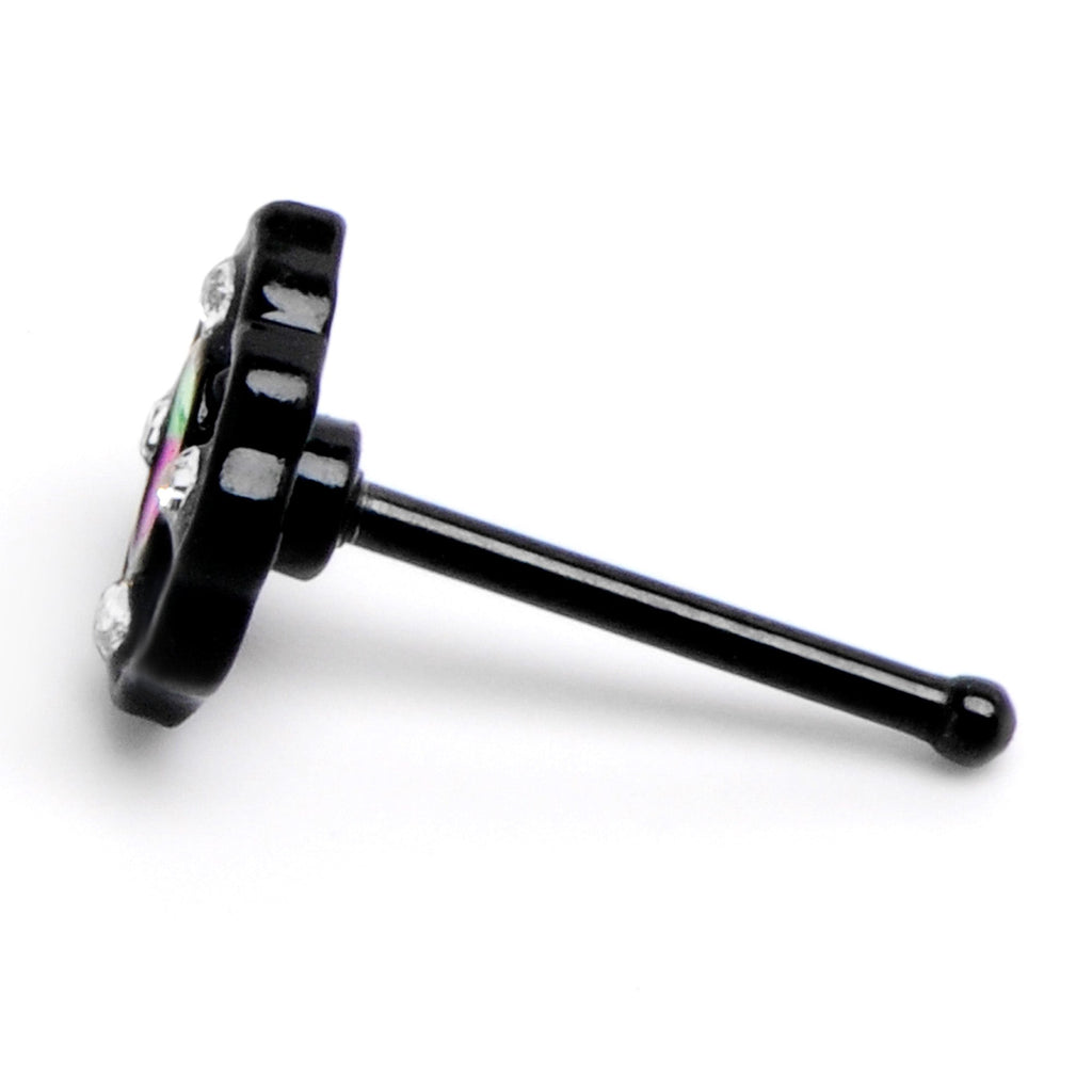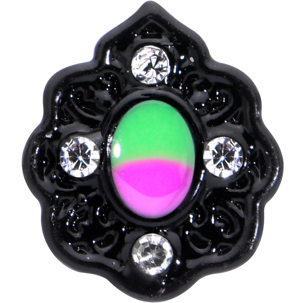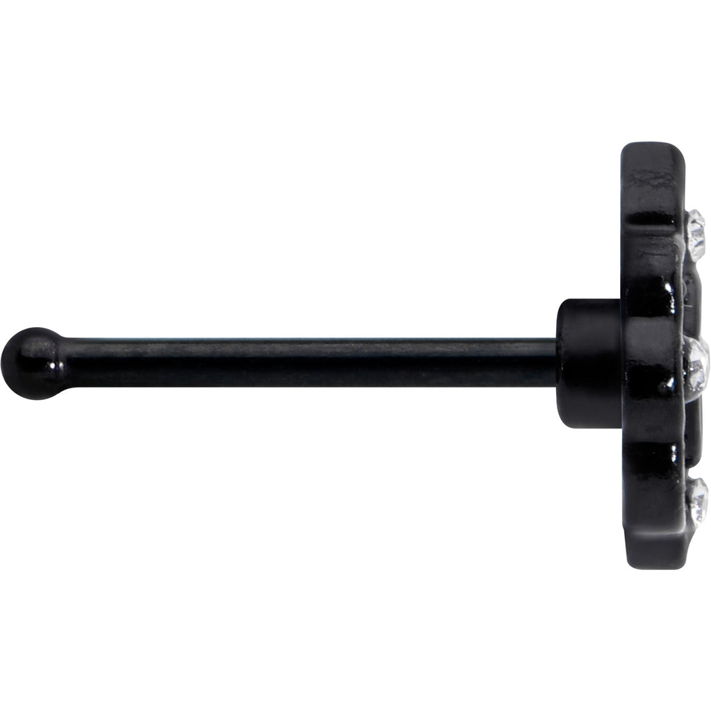 This 20 gauge nostril ring is full of fairy tale elegance. It is made with a 6mm black PVD over 316L surgical grade stainless steel straight post. It features a scalloped, oval charm. The charm is set at the center with a purple tourmaline for a look that is truly magical. It is further embellished with filigree detailing and clear cubic zirconia gems, for maximum elegance. You can not help but feel the magic when you're wearing this fairy tale-worthy nose piercing ring.