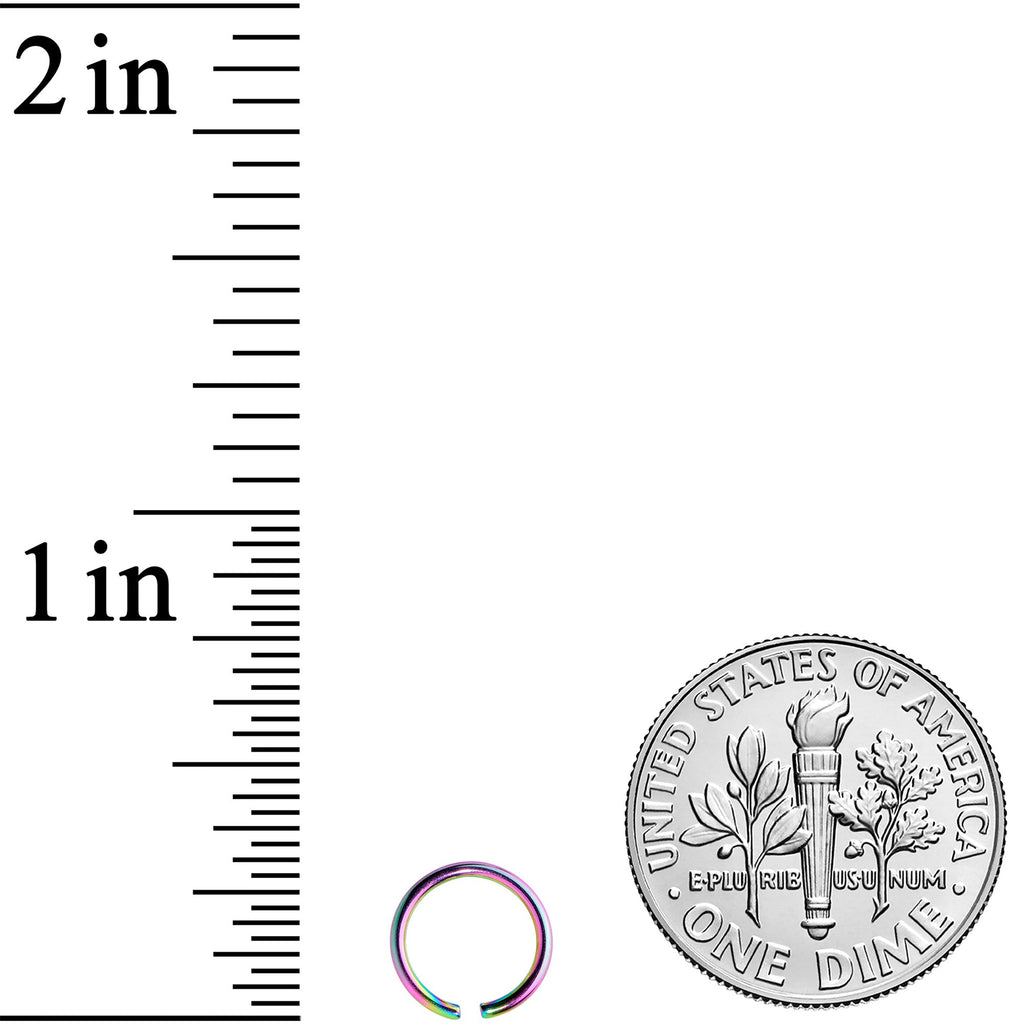 Sometimes we all need closure....sometimes we just need some awesome jewelry like this 20 gauge nostril ring! It's made with a 6mm rainbow PVD over solid grade 23 implant grade titanium circular ring. It features durable materials as well as simple style that never goes out of fashion. It also features rounded ends to make insertion and removal super comfortable. This hoop ring is super easy to insert and remove - simply twist the ring open, insert, and then twist gently shut again. Put some quality elegance in your nose piercing with this understated nostril piercing ring! This bendable titanium hoop can be used for multiple piercings including lip ring, cartilage and nose hoop.Specifications