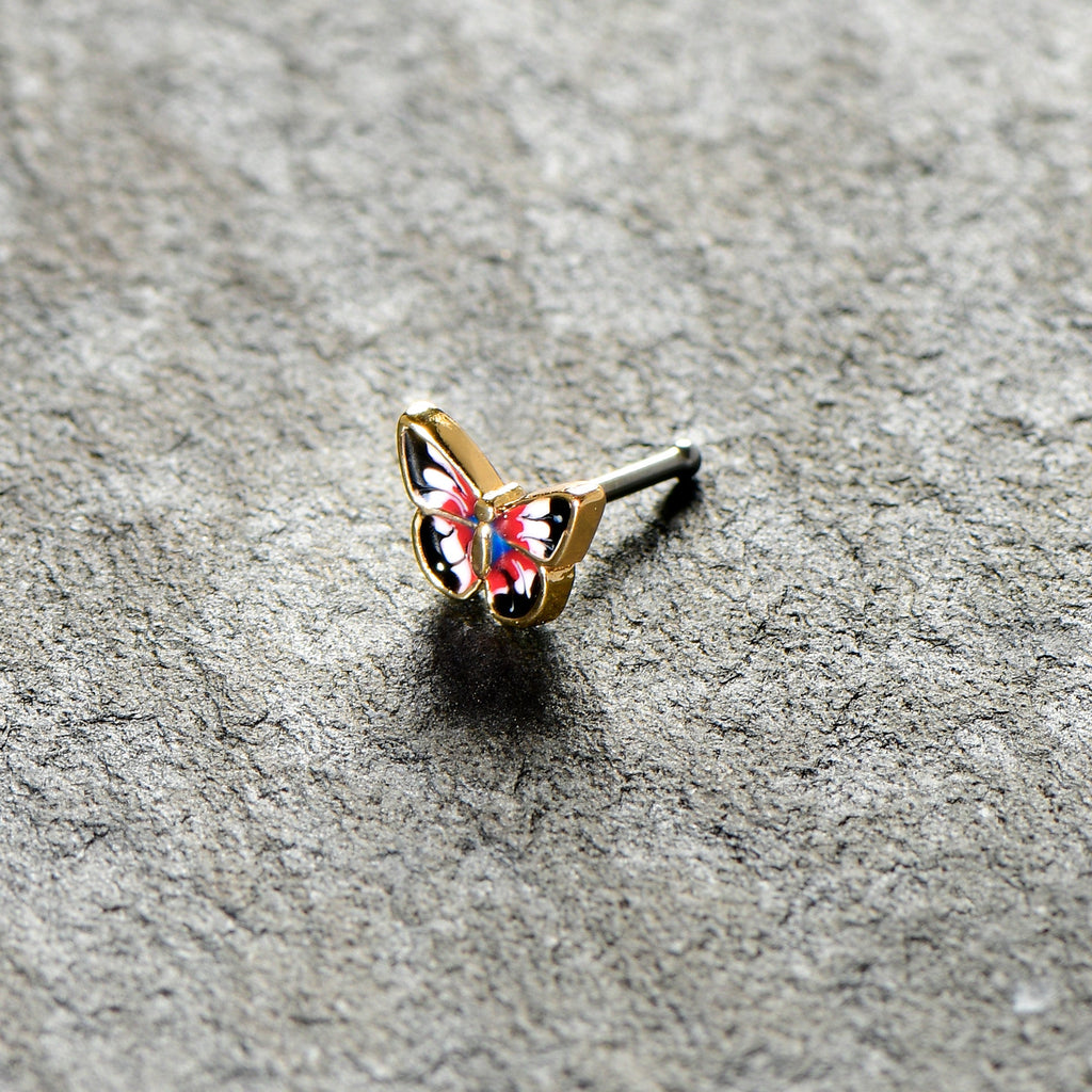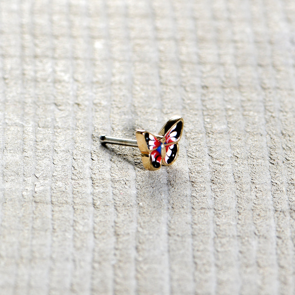 Spread your wings in striking color with this 20 gauge nostril ring! It's made with a 6mm durable 316L surgical grade stainless steel straight post. It features a butterfly charm, the wings inlaid in red and blue on a white background. You'll be ready to morph into something new and lovely with this butterfly nose piercing jewelry.Specifications