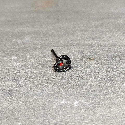 Get creepy, old school style with this gorgeous Halloween 20 gauge nostril jewelry! It's made with a 6mm black PVD over 316L surgical grade stainless steel straight post. It features a heart-shaped charm with skulls peeking out from the sides. The heart further features a red gem embellishment as well as clockwork embellishments along the bottoms for a touch of steampunk style. Add some gothic romance to your nose piercing this Valentine's Day with this striking, steampunk nostril piercing ring!Specifications