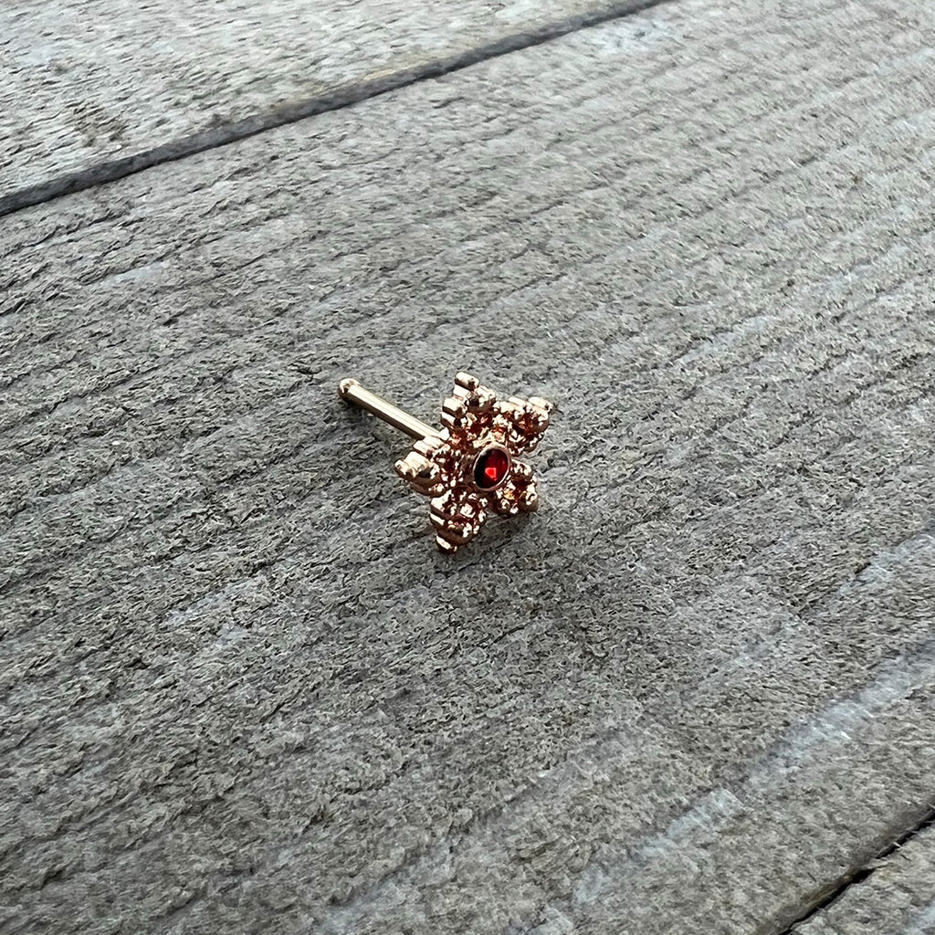 20 Gauge 1/4 Red Gem Rose Gold Tone Textured Snowflake Nose Bone