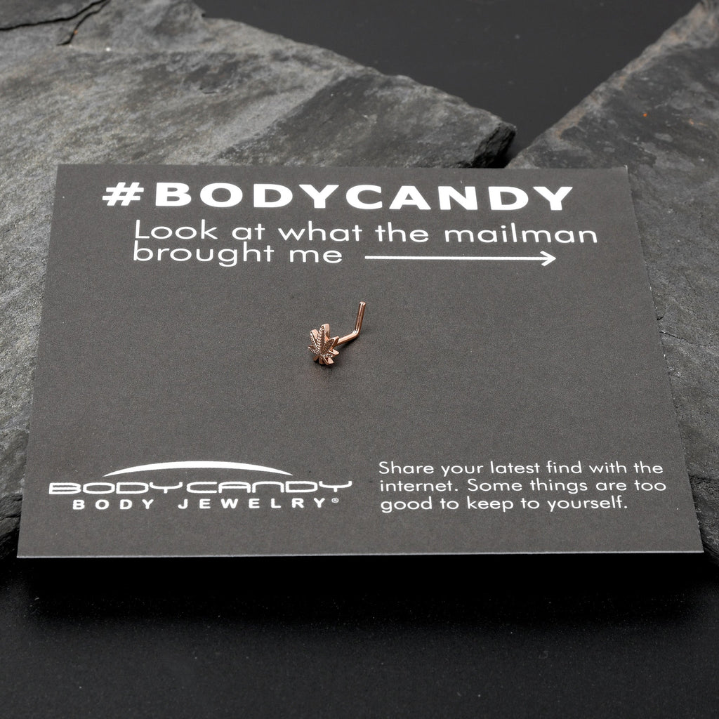 It is always 420 when you are rocking this 20 gauge nostril ring. It is made with a 6mm length at the bend rose gold tone anodized over 316L surgical grade stainless steel L-shaped post. It features a detailed marijuana leaf charm with textured detailing that is sure to catch the eye. Perfect for potheads, heavenly for hempers, this wonderful weed leaf nose piercing ring is sure to give you a buzz of style.Specifications