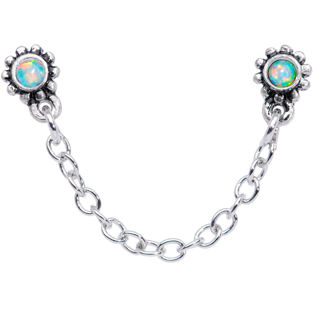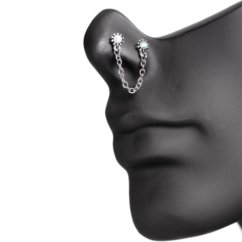 If you've got multiple nose piercings and are looking for brand new body jewelry then check out this 20 gauge double nose bone chain jewelry that you can wear in your multiple nostril piercings. Made with 6mm durable 316L surgical grade stainless steel posts, this double nose piercing jewelry features white synthetic opal ends and two nose bones connected by a dangle chain that can be worn in two piercings in one nostril or in high nostril piercings on either side of your nose.Specifications