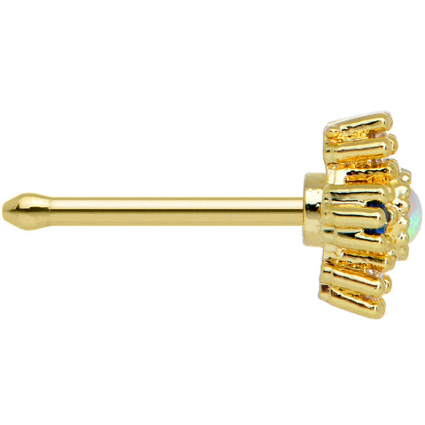 This 20 gauge nostril ring will unlock some grand style for your nose piercing! It's made with a 6mm gold tone PVD over 316L surgical grade stainless steel straight post. It features an ornate, textured design with a white synthetic opal at the center. It's further embellished with alternating clear and deep blue cubic zirconia gems along the edge. Unlock elegant style for your nostril piercing with this splendid, sunburst nose jewelry!Specifications