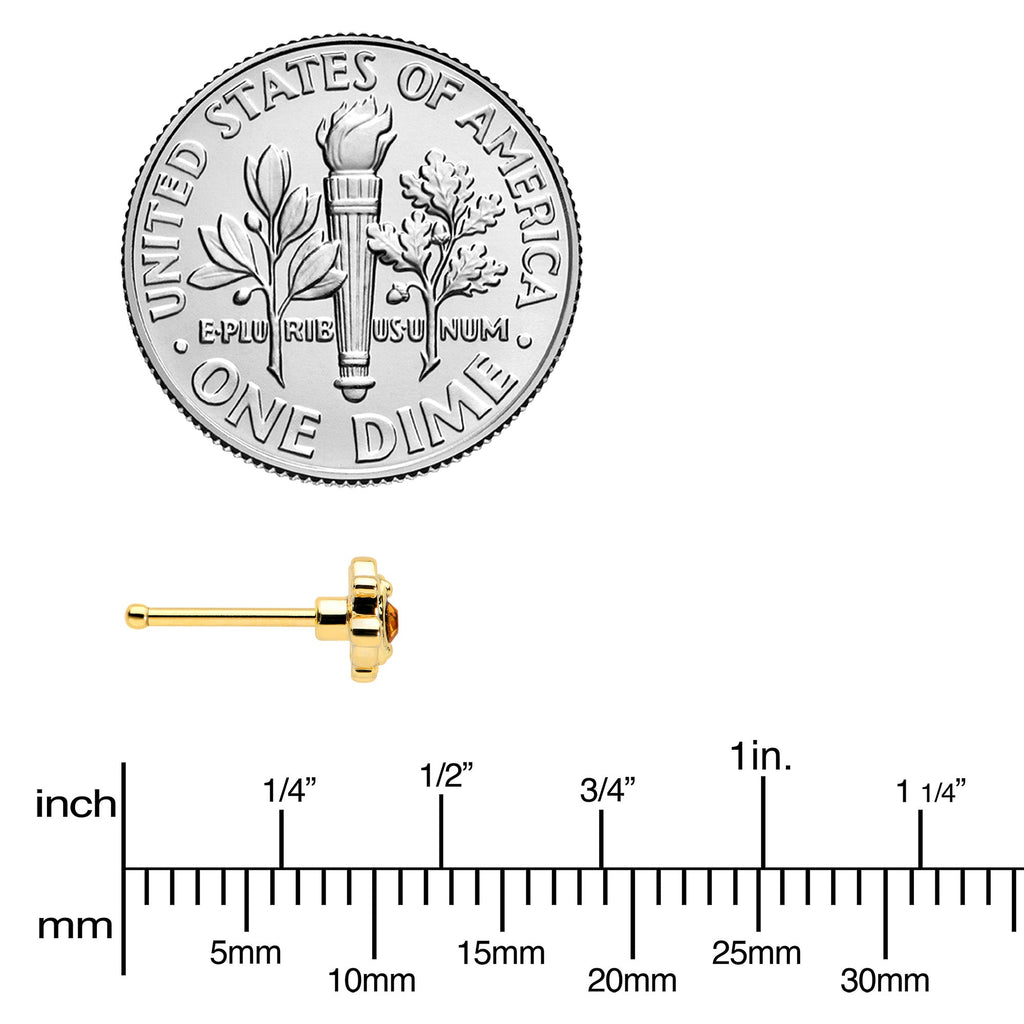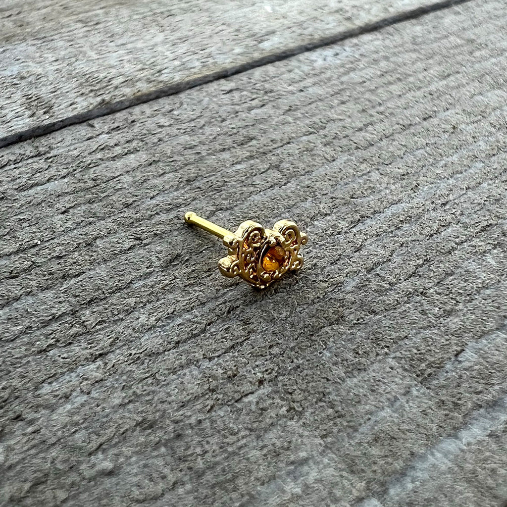 You'll be totally golden with this 20 gauge nostril ring! It's made with a 6mm gold tone PVD over 316L surgical grade stainless steel straight post. It features a scrollwork charm, with a light and airy appearance. It's further embellished with a yellow gem for a look that can't help but be noticed! Bring your nose piercing into a golden age of style with this scintillating scrollwork nostril piercing jewelry!Specifications