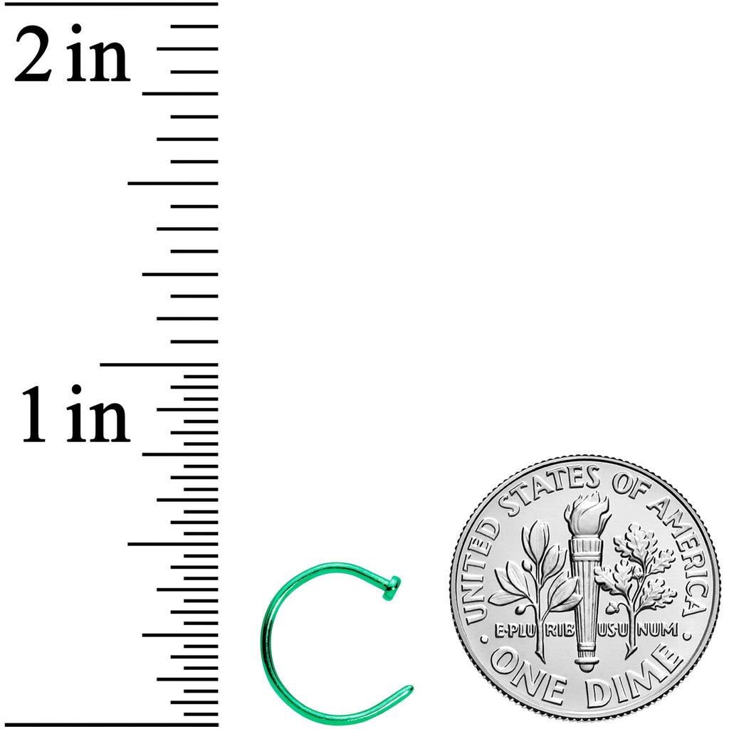 Sometimes the simple things in life are the best. Made of a green PVD over solid grade 23 implant grade titanium circular ring, this 20 gauge nostril ring is built for comfort as well as serious durability. It measures 10mm length and has a flat top to rest comfortably against your nostril so you'll barely notice that it's there. Simple beauty and simple comfort mean you're going to simply love it!Specifications