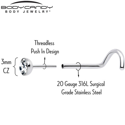 20 Gauge 3mm CZ Bezel Set Push-In Threadless Nose Screw Nose Ring