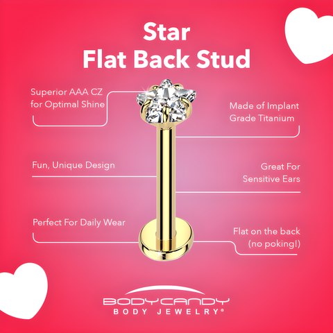 Simple and classic body jewelry is always in style, like this 20 gauge ear piercing jewelry. It's made with an 8mm gold tone PVD over ASTM F-136 implant grade titanium straight post with a flat disc back. It features a 3mm clear cubic zirconia prong-set gem star top that features a threadless design, for maximum comfort on insertion and removal and making it easy to change the end. Best of all, you can wear it in multiple piercings including earlobe and nostril piercings. Classic jewelry and modern style make this elegant flat back earring a star.