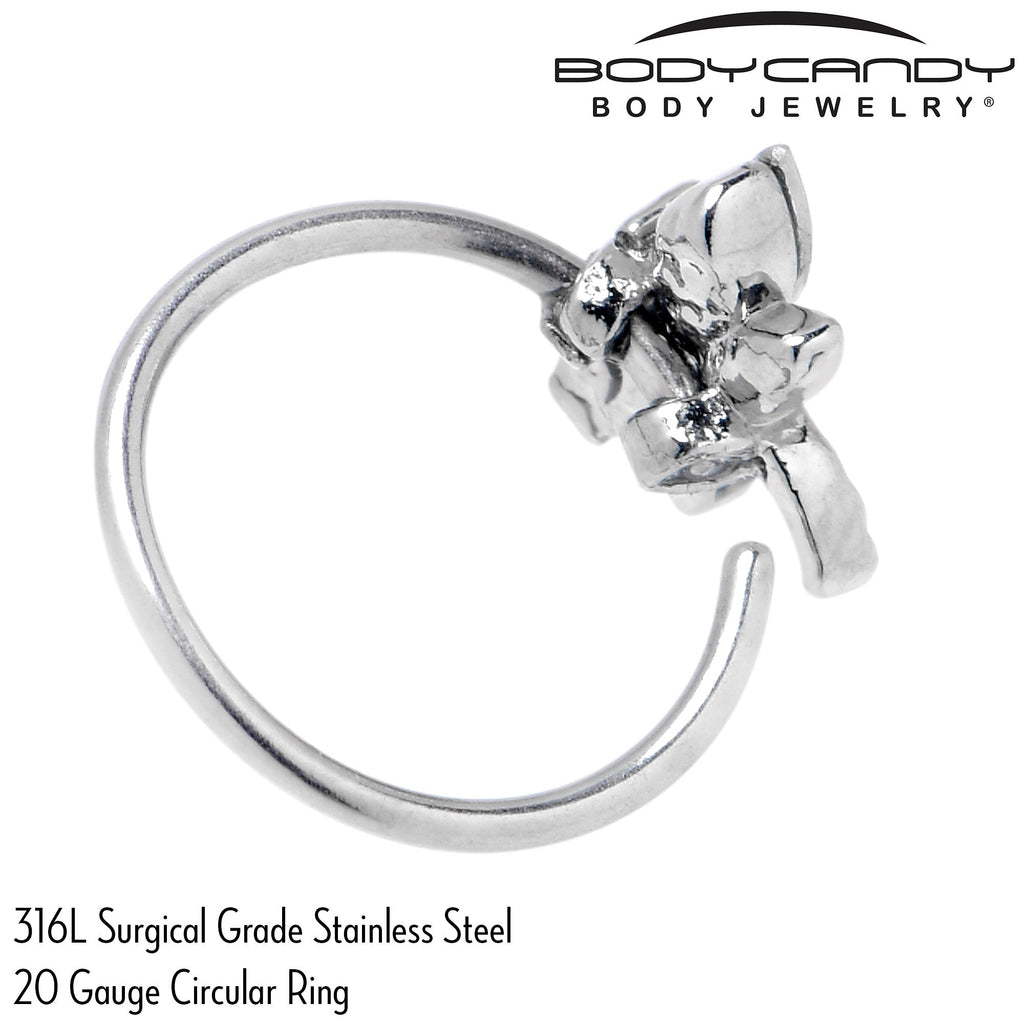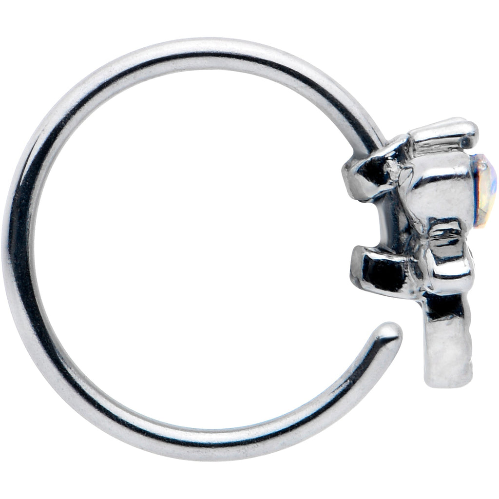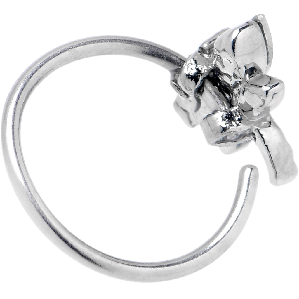 Dragonflies are constantly on the move so sometimes they just want to.....hang out. This 20 gauge nostril ring is made with an 8mm durable 316L surgical grade stainless steel circular ring. It features an ornate dragonfly charm, with the wings set with aurora cubic zirconia gems. The dragonfly is further embellished with clear cubic zirconia gems for a look that is both baroque and cohesive. You will want to hang out with this dragonfly nose piercing jewelry all the time.Specifications