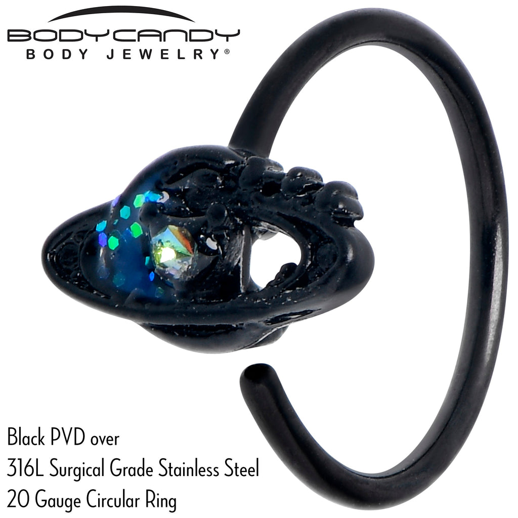 This 20 gauge nostril ring is out of this world. It's made with an 8mm black PVD over 316L surgical grade stainless steel circular ring. It features a planet Saturn charm, with the planet composed of a blue inlay crescent moon with an aurora gem heart. The ring around it is embellished with tiny stars for added style. These heavenly bodies are sure to make you a star with this celestial themed nose piercing jewelry.