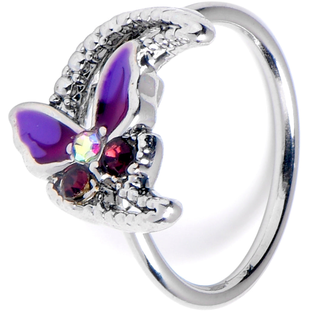 Give your look a charming flutter with this 20 gauge nostril ring. It is made with an 8mm durable 316L surgical grade stainless steel circular ring. It features a gorgeous butterfly charm, with purple wings and perched on a crescent moon . The butterfly features a aurora gem at the center. You will love the beautiful butterfly on this charming nose piercing jewelry all the way to the moon.Specifications