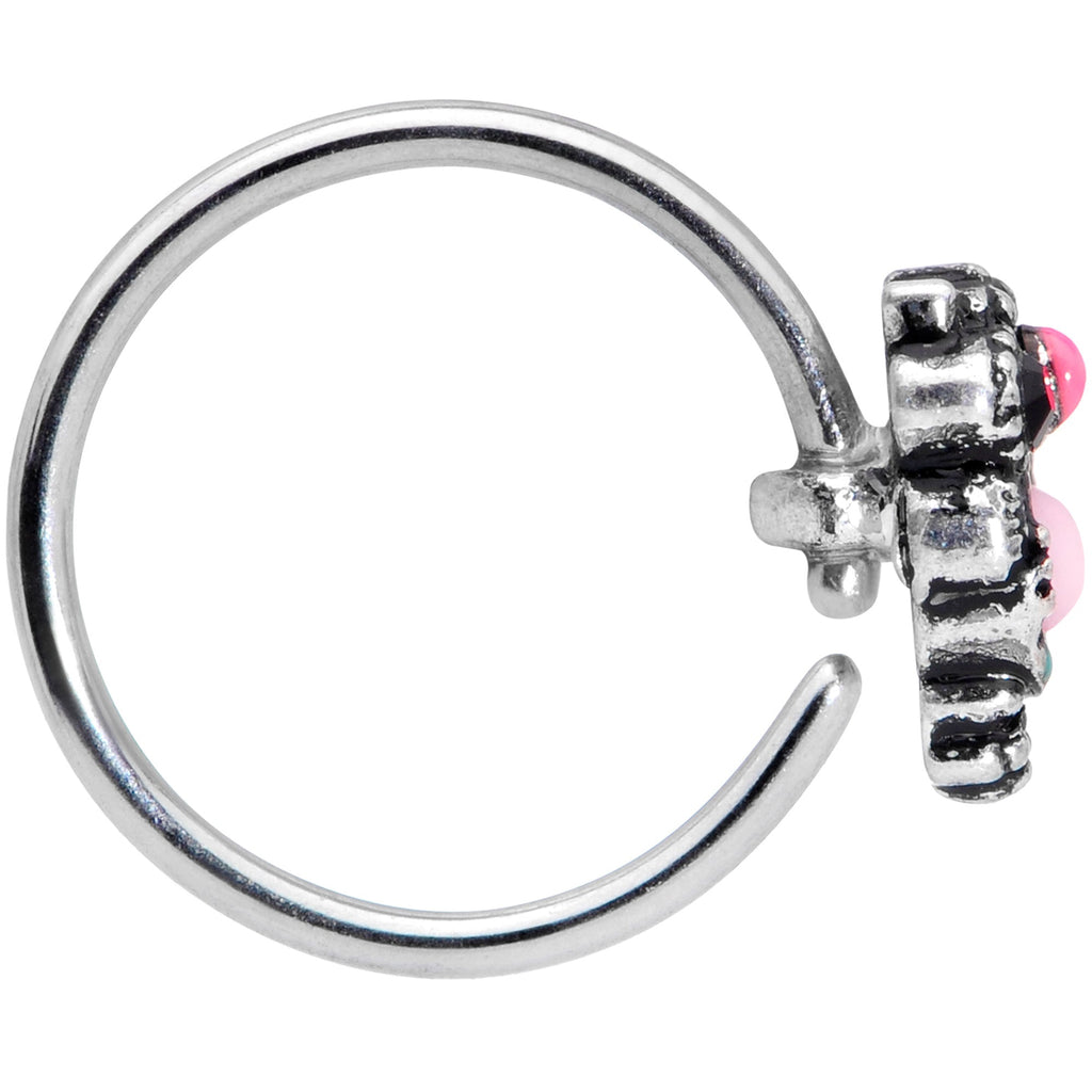 The feathered friend on this 20 gauge nostril ring will have your nose piercing looking fine! It's made with an 8mm durable 316L surgical grade stainless steel circular ring. It features an owl charm with black gem eyes. The owl is set with a pink orb on its belly and blue orbs beneath it for truly striking color contrast. It's sure to bring a hit of vibrant style to your nostril piercing!Specifications