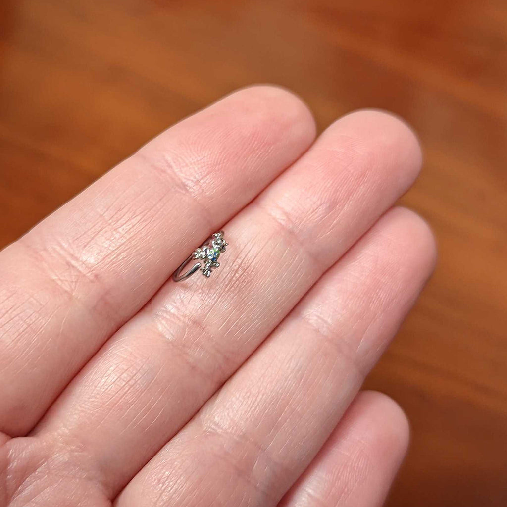 The frog on this 20 gauge nostril ring is adorably dotty! It's made with an 8mm durable 316L surgical grade stainless steel circular ring. It features a frog charm, with black gem eyes. The frog is embellished with blue and green polka dots for a look that's both whimsical and colorful. This frog is freaking fantastic!