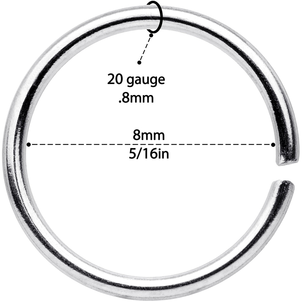 Whether you have multiple nostril piercings and prefer a matching look or are simply prone to losing things, this set of 20 gauge nose rings has you covered. Four are made with 8mm black anodized over 316L surgical grade stainless steel circular rings for a colorful and comfortable feel. Four are made with 8mm gold tone anodized over 316L surgical grade stainless steel seamless circular rings, for a classically elegant look. And you also get four made with 8mm durable 316L surgical grade stainless steel seamless circular rings for a traditional appearance. This nostril jewelry is super easy to insert and remove - simply twist the ring open, insert, and then twist gently shut again. And with so many in the set, you can be sure of always having a beautiful nose ring to wear! Sold as a set of twelve. These are universal seamless rings for multiple body piercings including ear, lip and septum or nose.Specifications