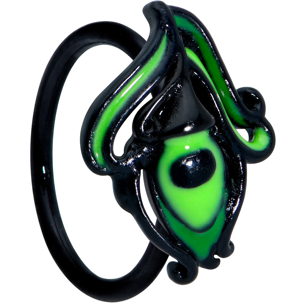 This 20 gauge nostril ring is so striking you can hardly take your eyes off of it! It's made with an 8mm black PVD over 316L surgical grade stainless steel circular ring. It features a peacock feather charm, inlaid in an eerie bright green. It's even embellished with tendrils along the side, giving it the appearance of a real feather! You'll definitely want to strut your stuff when you're nesting this avian nose ring in your nostril piercing!Specifications