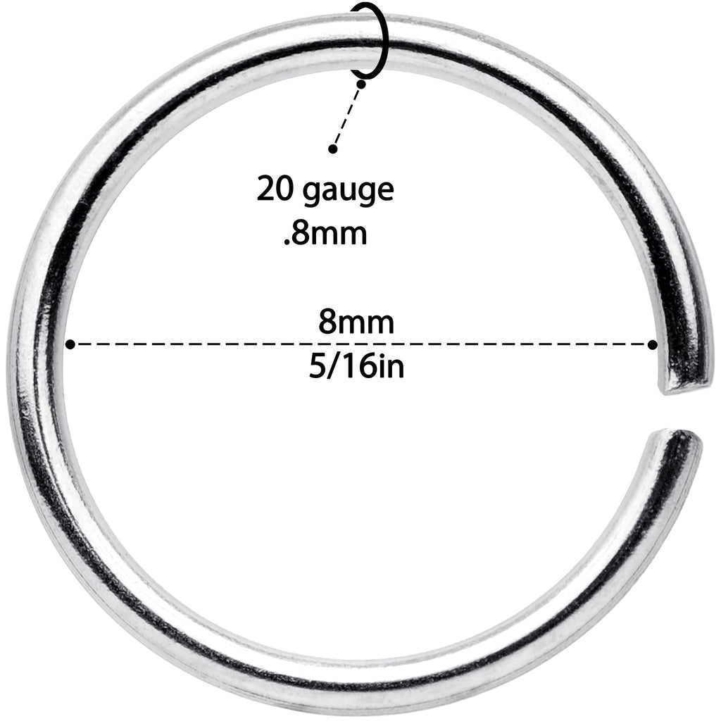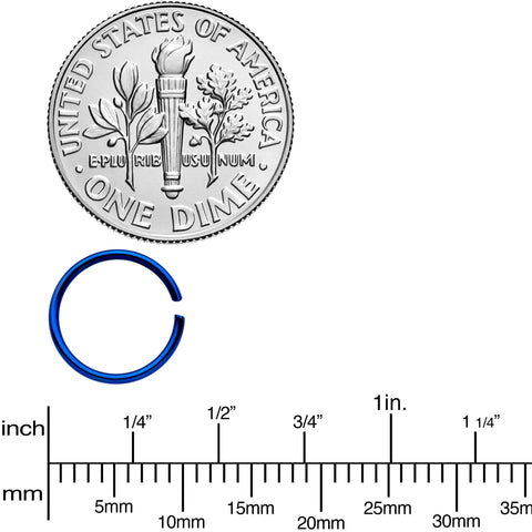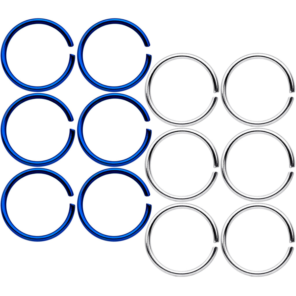 Whether you have multiple nostril piercings and prefer a matching look or are simply prone to losing things, this set of 20 gauge nose rings has you covered. Half are made with 8mm blue anodized over 316L surgical grade stainless steel circular rings and the other half from 8mm durable 316L surgical grade stainless steel circular rings for a choice of color and comfortable feel. This nostril jewelry is super easy to insert and remove - simply twist the ring open, insert, and then twist gently shut again. And with so many in the set, you can be sure of always having a beautiful nose ring to wear! Sold as a set of twelve.