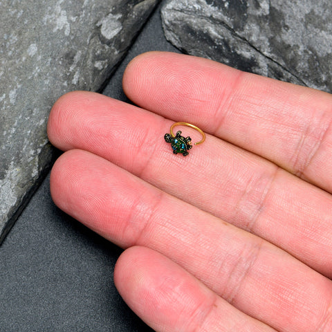 The turtle on this 20 gauge nostril ring is all decked out in glitzy style. It's made with an 8mm gold tone PVD over 316L surgical grade stainless steel circular ring. It features a turtle charm, with blue gems set into its back, as well as textured detailing for added style. It even features a sweetly whimsical expression on the turtle's face. You will be swimming in style when you're rocking this colorful turtle nose piercing jewelry.Specifications