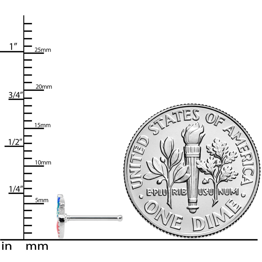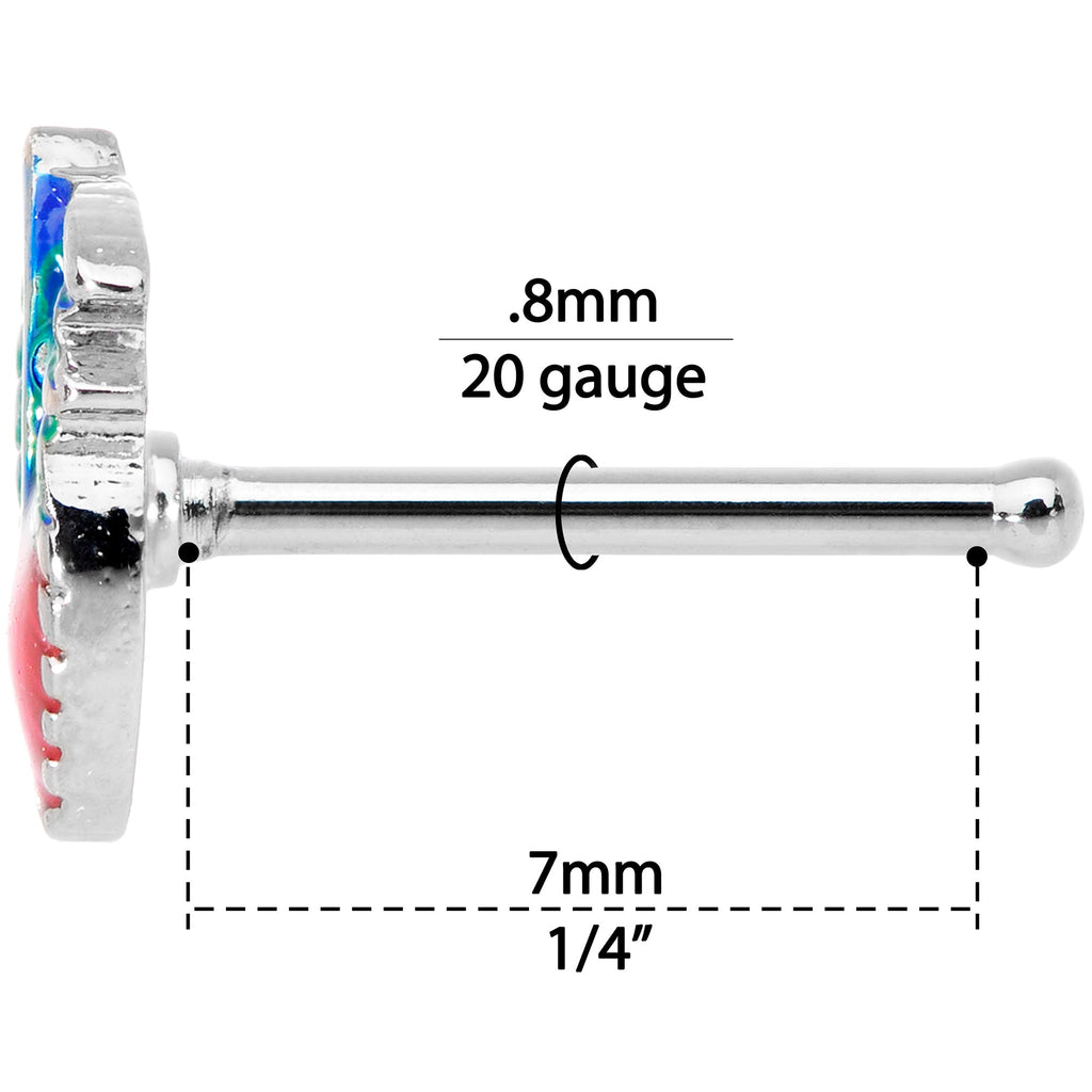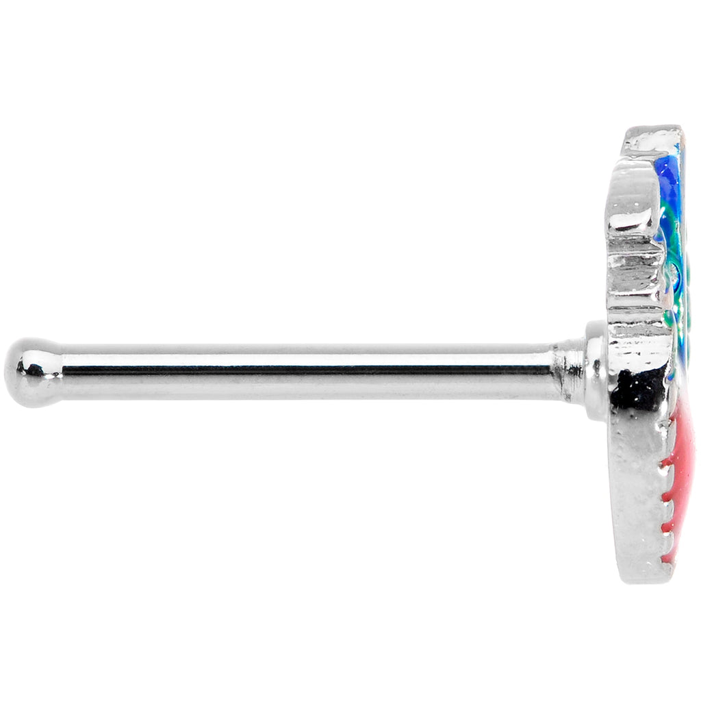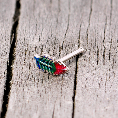 This 20 gauge nose jewelry is sure to make your heart soar with its lovely colors! It's made with an 8mm length at the bend 316L surgical grade stainless steel L-shaped post. It features a feather charm with an eye-catching combination of red, blue, and green coloring. This looks like it could have come right from an exotic parrot! Get some feathery finery for your nose piercing with this wonderfully colorful nostril stud!