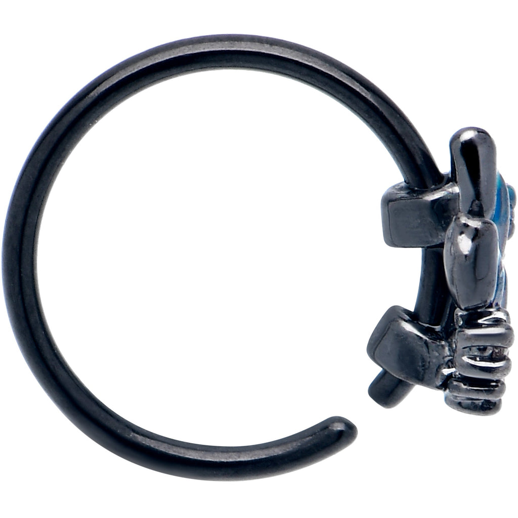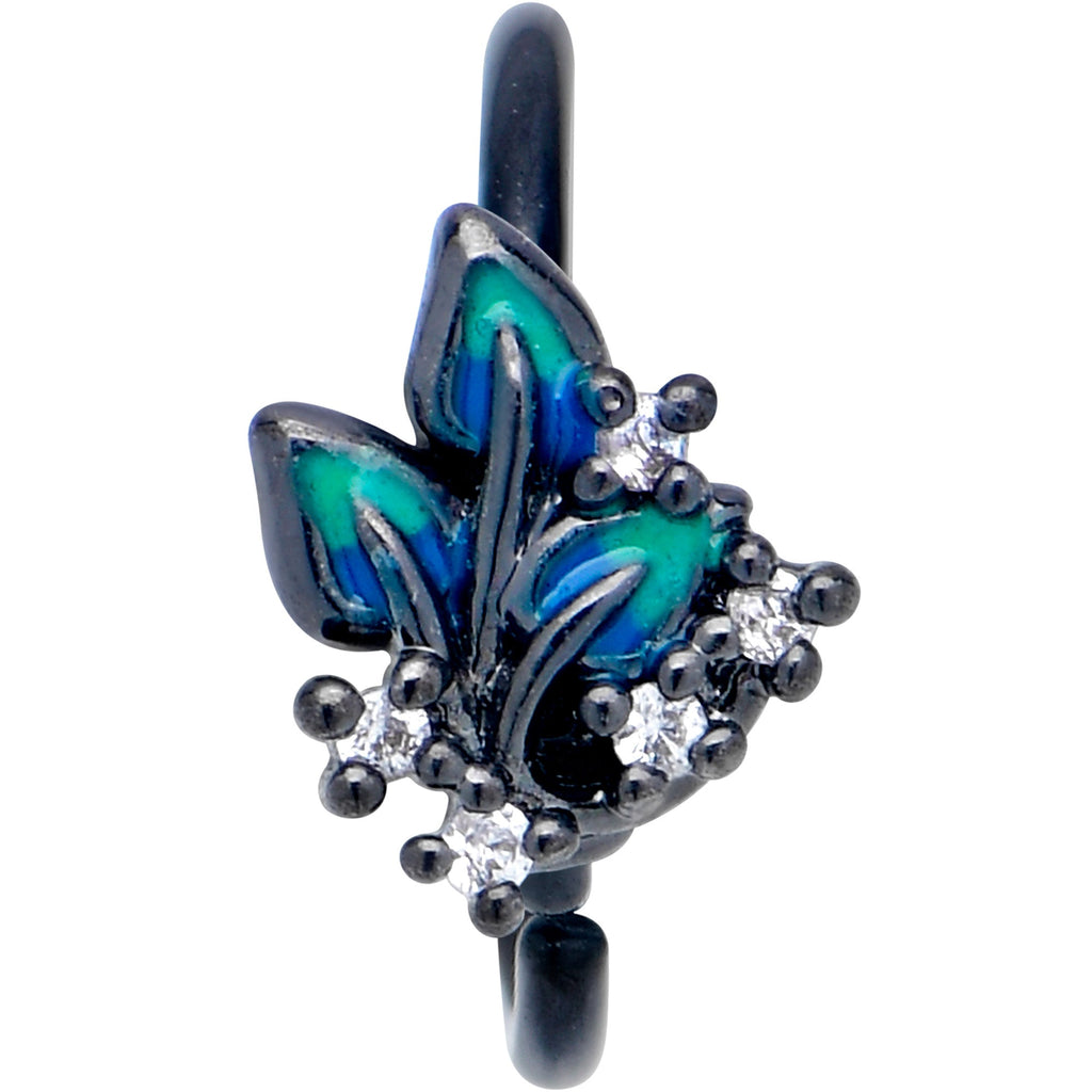 Get a lush, tropical look with this leafy 20 gauge nostril ring. It's made with an 8mm black PVD over 316L surgical grade stainless steel circular ring. It features a green and blue leaves charm, embellished with clear cubic zirconia gems. You'll be looking luscious and lovely when you are rocking this tropically styled nose piercing jewelry,Specifications