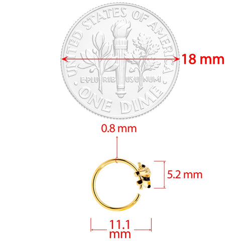 This little be can't wait to help make you more beee-autiful! This 20 gauge nose ring is made with an 8mm gold tone PVD over 316L surgical grade stainless steel circular ring. It features a bumble bee charm end set with clear cubic zirconia gems and is easy to insert. Simply twist gently, insert into your piercing, and then twist shut again.Specifications