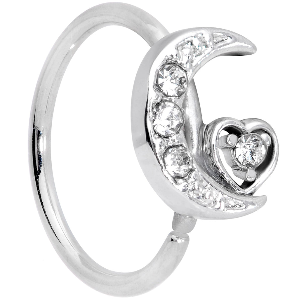 Love your piercings all the way to the moon with this elegant 20 gauge nose ring! It's made with an 8mm durable 316L surgical grade stainless steel circular ring. It features a crescent moon charm set with several small clear cubic zirconia gems. Set on the bottom curve of the moon is a small heart, also set with a clear cubic zirconia gem. Send your heart into orbit with this lovely lunar nostril jewelry!Specifications