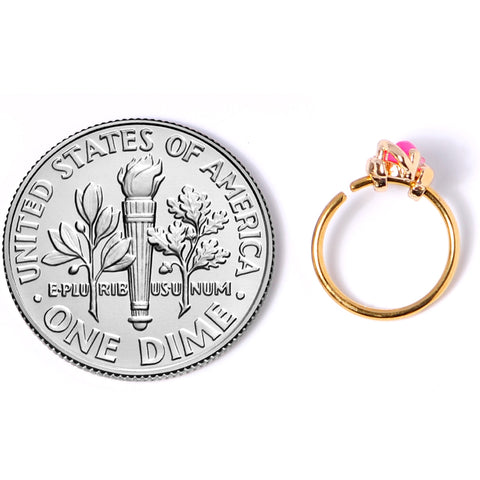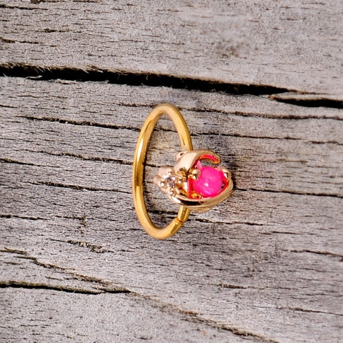 Make your nostril piercing look out of this world with this 20 gauge nose ring! It's made with an 8mm gold tone PVD over 316L surgical grade stainless steel circular ring. It features a pink faux opal, set within a crescent and surrounded by a ring, much like the planet Saturn. It even has a tiny clear cubic zirconia gem next to it, much like a tiny little star! And your nose piercing will definitely be a star with this elegant, colorful nostril jewelry!