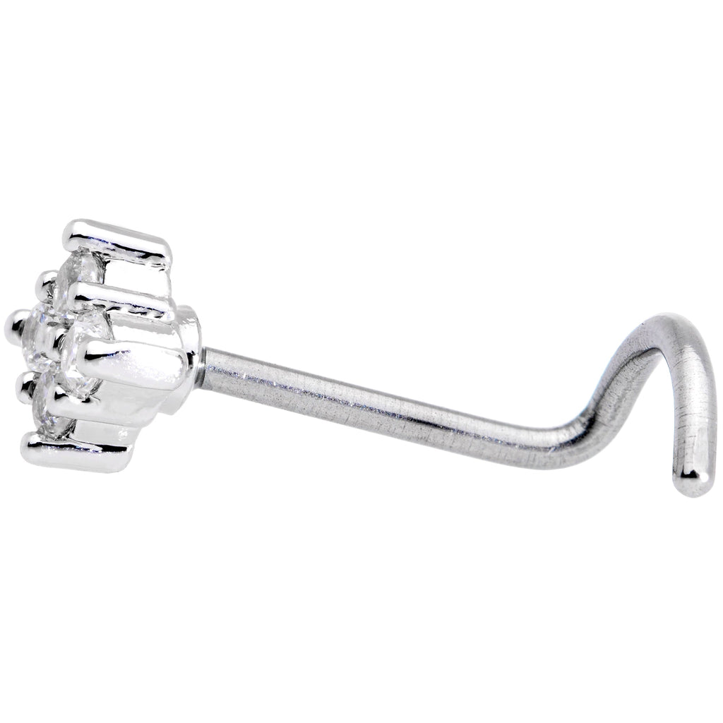 Looking for some simple nose jewelry with a twist? Look no further! This classic 20 gauge nostril screw features a clear cubic zirconia gem cluster end with an 8mm length at the bend post made with 316L surgical grade stainless steel. Pick up this simple yet noticeable nose piercing today!