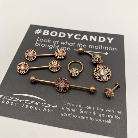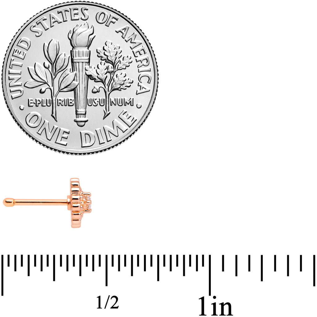 Love your nose piercing with all your hearts with this 20 gauge nostril ring! It's made with an 8mm rose gold tone PVD over 316L surgical grade stainless steel straight post. The front end features a circle of stylized, openwork hearts and is set at the center with a clear cubic zirconia gem for added style. With such beautiful styling and elegant design, this nostril jewelry is sure to steal your hearts this Valentine's Day!